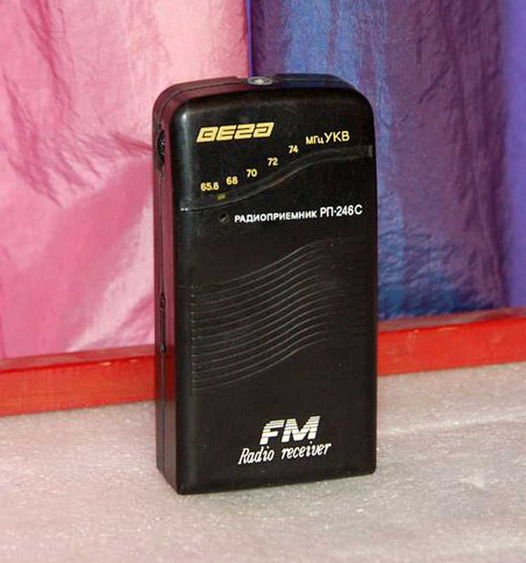Малогабаритный УКВ радиоприёмник *Вега РП-246С* выпускался с 1995 года Бердским ПО *Вега*. Радиоприёмник рассчитан на приём радиовещательных станций со стереофоническим вещанием в диапазоне 65,8...74 МГц. Принимаются и монофонические станции. Прослушивание ведётся на малогабаритные стереофонические телефоны, а их проводники являются и антенной для приёма. Чувствительность 10 мкВ. Номинальная выходная мощность 10 мВт. Диапазон звуковых частот не уже 63...12500 Гц. Питание приёмника осуществляется от двух встроенных аккумуляторов общим напряжением 2,4 В. Имеется встроенная подзарядка аккумуляторов от электрической сети. Заряда аккумуляторов достаточно для непрерывной работы приёмника в течении 10...12 часов. Приёмник был выпущен ограниченной серией.