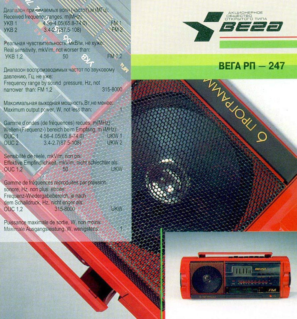 Стационарный транзисторный радиоприёмник *Вега РП-247* подготовило к выпуску с 1995 года Бердское АООТ *Вега*. Сетевой радиоприёмник **Вега-247** предназначен для приёма вещательных радиостанций в двух УКВ диапазонах, отечественном 65,8...74 МГц и европейском 87,5...108 МГц. В приёмнике имеются встроенные электронные часы с функцией таймера и будильника. Кроме этого радиоприёмник имеет следующий набор эксплутационных и сервисных удобств: светодиодную индикацию включенного диапазона, автоматическое переключение диапазонов при переходе указателя настройки на соответствующую частоту, блок фиксированных настроек, для беспоискового включения любой из 6 заранее настроенных радиостанций, индикацию включения в сеть, возможность приёма с помощью выдвижной телескопической или внешней антенны. Чувствительность в обоих УКВ диапазонах 50 мкВ. Диапазон воспроизводимых частот по звуковому давлению 315...8000 Гц. Максимальная выходная мощность 1 Вт. Габариты радиоприёмника 320х120з95 мм. Масса 1,5 кг. Серийно радиоприёмник *Вега РП-247* не выпускался.