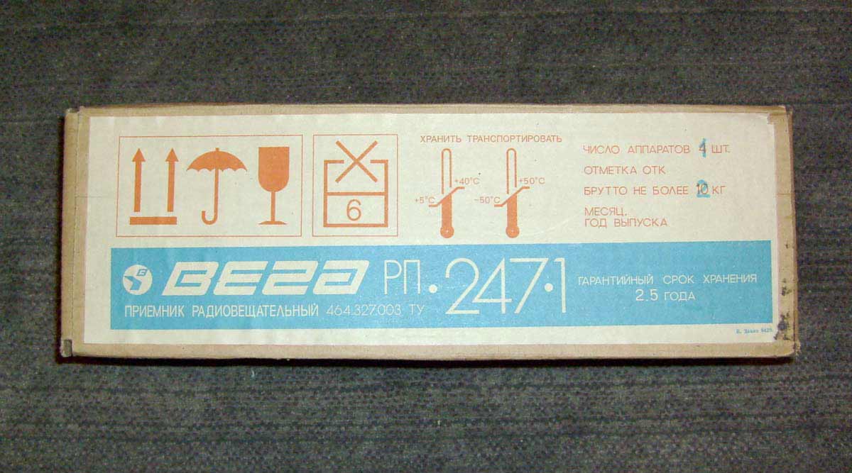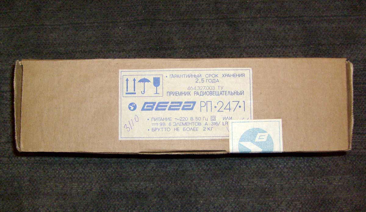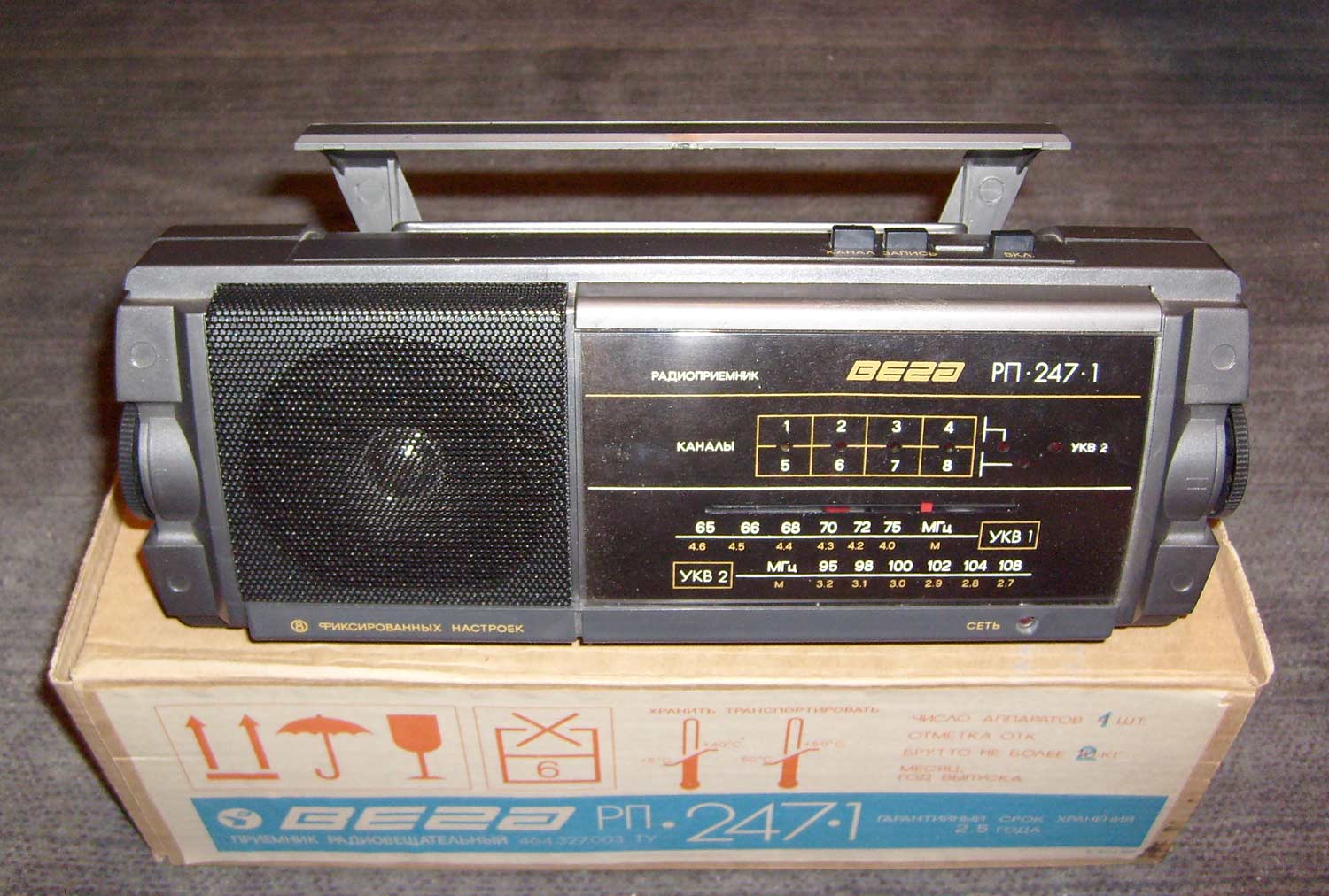 Переносной радиоприёмник *Вега РП-247-1* с 1995 года выпускало Бердское АООТ *Вега*. Приёмник **Вега-247-1** схож с сетевой моделью *Вега РП-247*, отличаясь отсутствием электронных часов и автономным питанием. Приёмник предназначен для приёма радиостанций с ЧМ в двух диапазонах УКВ и имеет: Индикацию включения в сеть. Регулировку громкости. Плавную настройку. Фиксированные настройки на 8 радиостанций. Индикацию включенного диапазона и фиксированных настроек. Диапазоны: УКВ-1 65,8...74,0 МГц. УКВ-2 95,0...108,0 МГц. Чувствительность, ограниченная шумами в диапазонах: УКВ-1 5 мкВ, УКВ-2 7 мкВ. Максимальная выходная мощность при питании от сети 1 Вт. Габариты приёмника 320х122,5х90,5 мм. Масса без батарей 1,5 кг. Приёмник выпускался в 2 вариантах оформления.