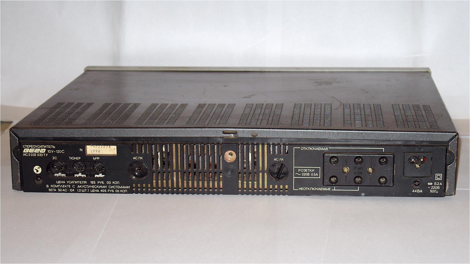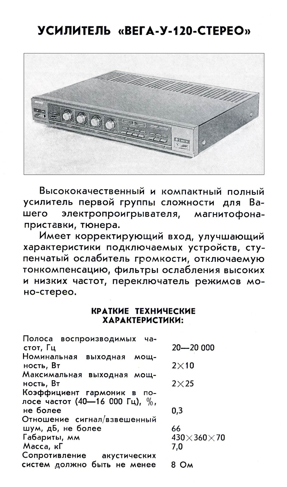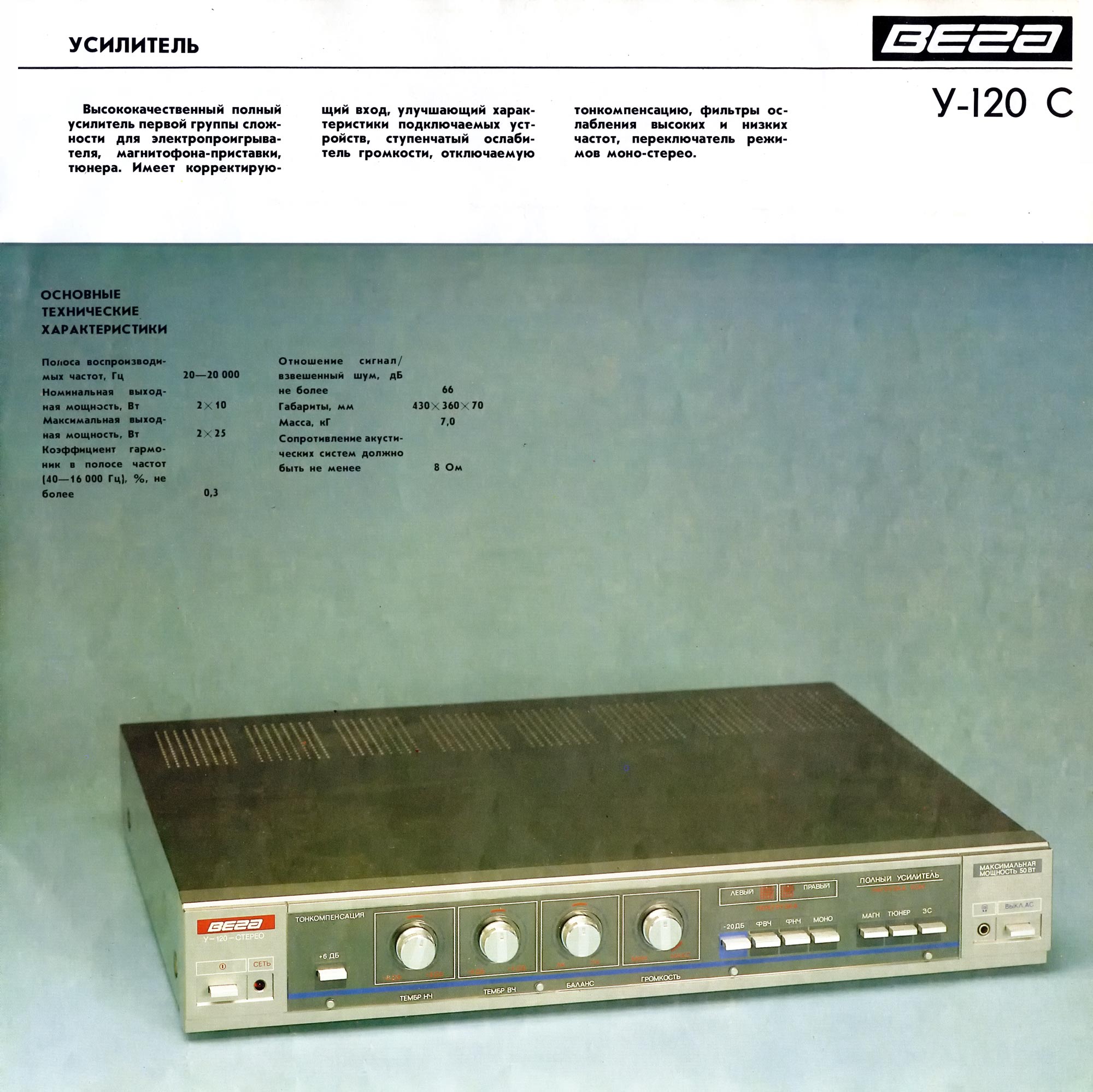 Усилитель *Вега У-120-стерео* с I-кв 1987 года выпускал Бердский радиозавод. **Вега У-120-стерео**, позднее **Вега 10У-120-стерео** - полный усилитель 1-й группы сложности. Он предназначен для усиления сигналов от различных источников. Усилитель имеет: коммутацию входов источников программ; регулировку тембров ВЧ и НЧ, громкости и стереобаланса; ступенчатое изменение громкости; включение фильтров ВЧ и НЧ; индикаторы сети и перегрузки. Усилитель имеет входы звукоснимателя, магнитофона, тюнера, АС и телефонов. Диапазон рабочих частот 20..20000 Гц. Номинальная выходная мощность 2х10 Вт. Потребляемая мощность 44...120 Вт. Габариты 430х70х360 мм. Масса 7 кг.