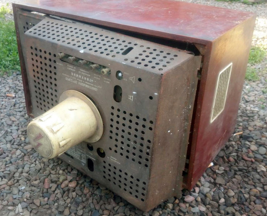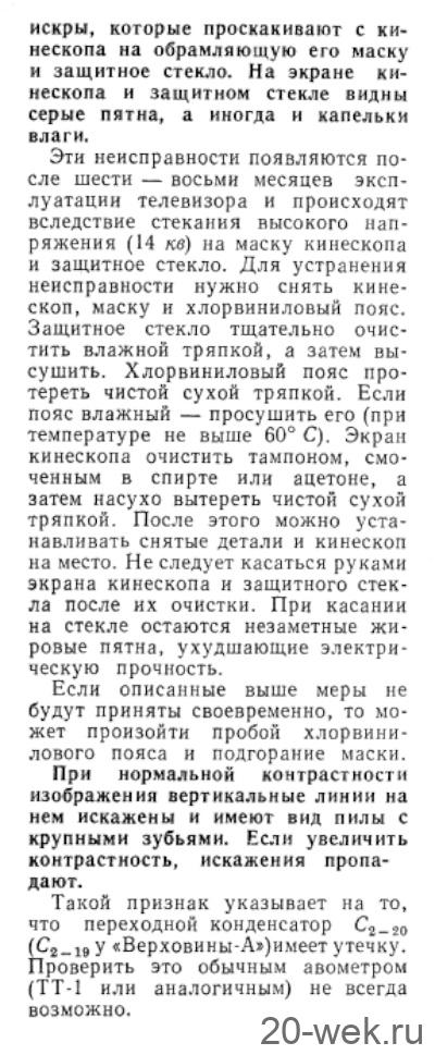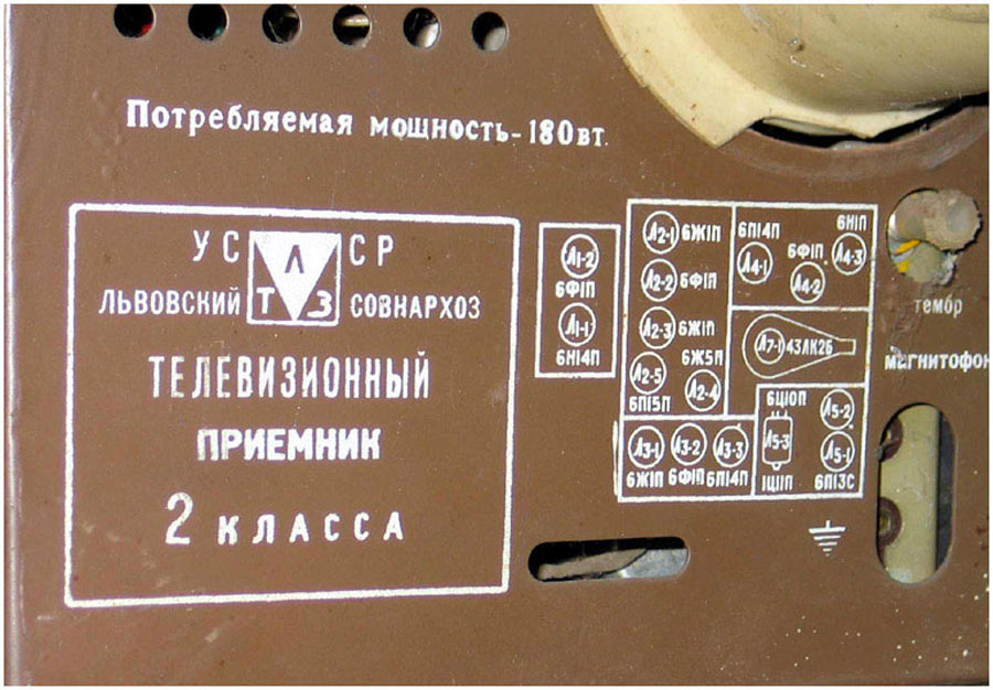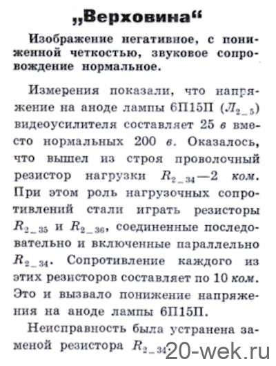 Телевизор *Верховина* с 1960 года выпускал Львовский телевизионный завод. Первая партия телевизоров имела оформление лицевой панели как на 1-м изображении. Телевизор содержит 16 радиоламп, 9 диодов и кинескоп 43ЛК2Б. Размер изображения 270 х 360 мм. Чувствительность в 100 мкВ позволяет вести приём на наружную антенну в радиусе до 70 километров. Громкоговорители 1ГД9 и 2ГД3 расположенные на передней панели и боковой стенке при мощности усилителя НЧ в 1,5 Вт дают громкий звук. Диапазон воспроизводимых частот 100...7000 Гц. В аппарате имеются АРУ, АПЧ и Ф строчной развёртки, АРЯ. Широкое применение пластмассы в сочетании с футляром из дерева ценных пород или с их имитацией придают телевизору привлекательный вид. Основные ручки для необходимых регулировок выведены на лицевую панель. Вспомогательные находятся сзади. Платы с элементами, расположенные на вертикальном шасси выполнены печатным способом. Питание - 127 или 220 В. Потребляемая мощность 180 Вт. Габариты ТВ 570 х 400 х 330 мм. Масса 29 кг. Цена с ценными породами дерева 300 рублей, с имитацией 288 рублей после реформы 1961 г. Радио №4/1965, ст. 30 Радио №9/1966, ст.39