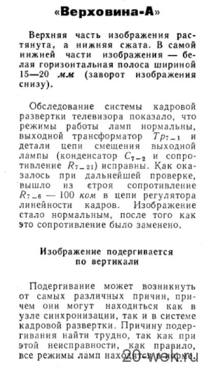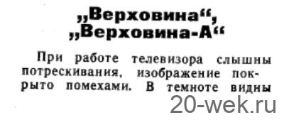 Телевизионный приёмник чёрно-белого изображения *Верховина-А* с 1962 года выпускал Львовский телевизионный завод. Телевизор имеет 16 ламп, 9 п/п диодов, кинескоп 43ЛК2Б и представляет собой модернизированную модель телевизора **Верховина**. Изменения направлены на повышение его эксплуатационной надежности. Размер изображения 270 х 360 мм. Чувствительность в 100 мкВ позволяет вести уверенный приём на наружную антенну передач в радиусе до 70 км от студии. Громкоговорители 1ГД-9 и 2ГД-3, расположенные на передней панели и на боковой стенке обеспечивают громкое звучание. Применение систем АРУ, АРЯ и схемы инерционной синхронизации с АПЧ и Ф упростило обращение с телевизором. Несимметричное расположение экрана, применение пластмассы, в сочетании с деревянным футляром с отделкой ценными породами дерева или имитацией придают телевизору красивый вид. В зависимости от отделки на телевизор установлены две цены. Основные регулировки аппарата выведены на лицевую панель. Вспомогательные находятся сзади. Монтаж элементов на платах печатный. Потребляемая мощность 180 Вт. Габариты ТВ - 570 х 400 х 330 мм. Масса 29 кг. Всего телевизоров **Верховина-А** выпущено ~ 70 тысяч штук. Радио №2/1965, ст. 57 Радио №4/1965, ст. 30 Радио №4/1966, ст.26 Через 5—7 мин после включения нарушается синхронизация по строкам. Вращая ручку регулятора частоты строк, можно добиться восстановления нормального изображения, но через 1 — 1,5 мин строчная синхронизация вновь нарушается. Такие признаки неисправности появляются тогда, когда конденсатор С4_2о—8200 пф в фильтре системы АПЧ и Ф имеет утечку. Для устранения неисправности следует заменить этот конденсатор. Радио №9/1966, ст.39