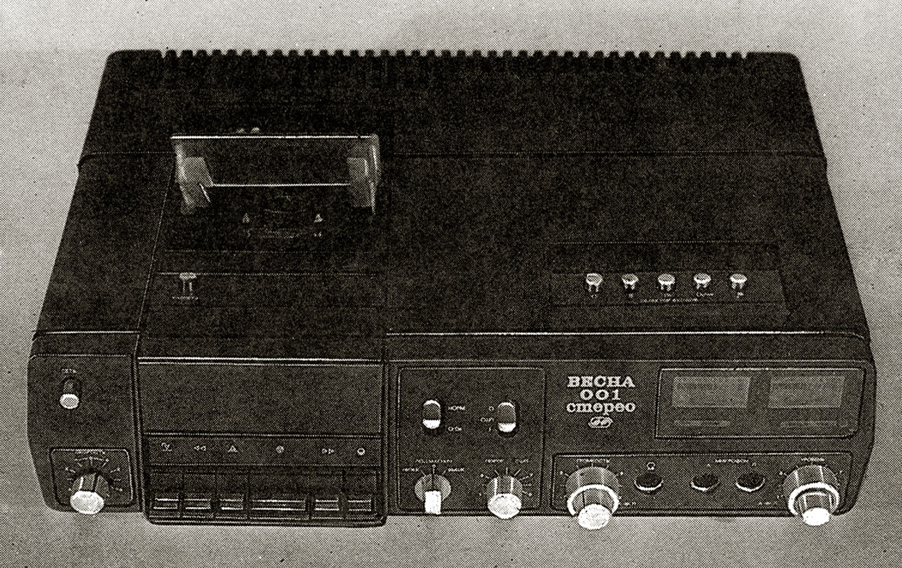 Кассетная магнитофонная приставка *Весна-001-стерео* в 1980 году опытно выпущена Запорожским электромашиностроительным заводом *Искра*. Стационарная стереофоническая, со сквозным каналом кассетная магнитофонная приставка высшего класса **Весна-001-стерео** рассчитана на запись и воспроизведение речевых и музыкальных программ с магнитных лент на основе окиси железа и двуокиси хрома. ЛПМ мг-приставки двухдвигательный с закрытым трактом и прямым приводом. Предусмотрены акустический контроль записи, оперативная регулировка скорости протяжки ленты, световая индикация режимов работы ЛПМ, автостоп при окончании ленты в кассете. В МП имеются отключаемая динамическая система шумопонижения с регулируемым порогом срабатывания, счетчик расхода ленты с устройством память, облегчающим поиск нужного места фонограммы, а также пиковые индикаторы уровня записи звука. В модели применена оригинальная система управления режимами ЛПМ с помощью коммутационного устройства с сенсорными датчиками. Скорость протяжки магнитной ленты 4,76 см/с. Коэффициент детонации ±0,15%. Рабочий диапазон звуковых частот на линейном выходе при использования ленты на основе двуокиси хрома не хуже 30...16000 Гц, окиси железа 40...12500 Гц. Снижение уровня шума при включении устройства шумопонижения -8 дБ. Потребляемая от элекрической сети мощность 40 Вт. Габариты аппарата 464х350х140 мм. Масса 9 кг.