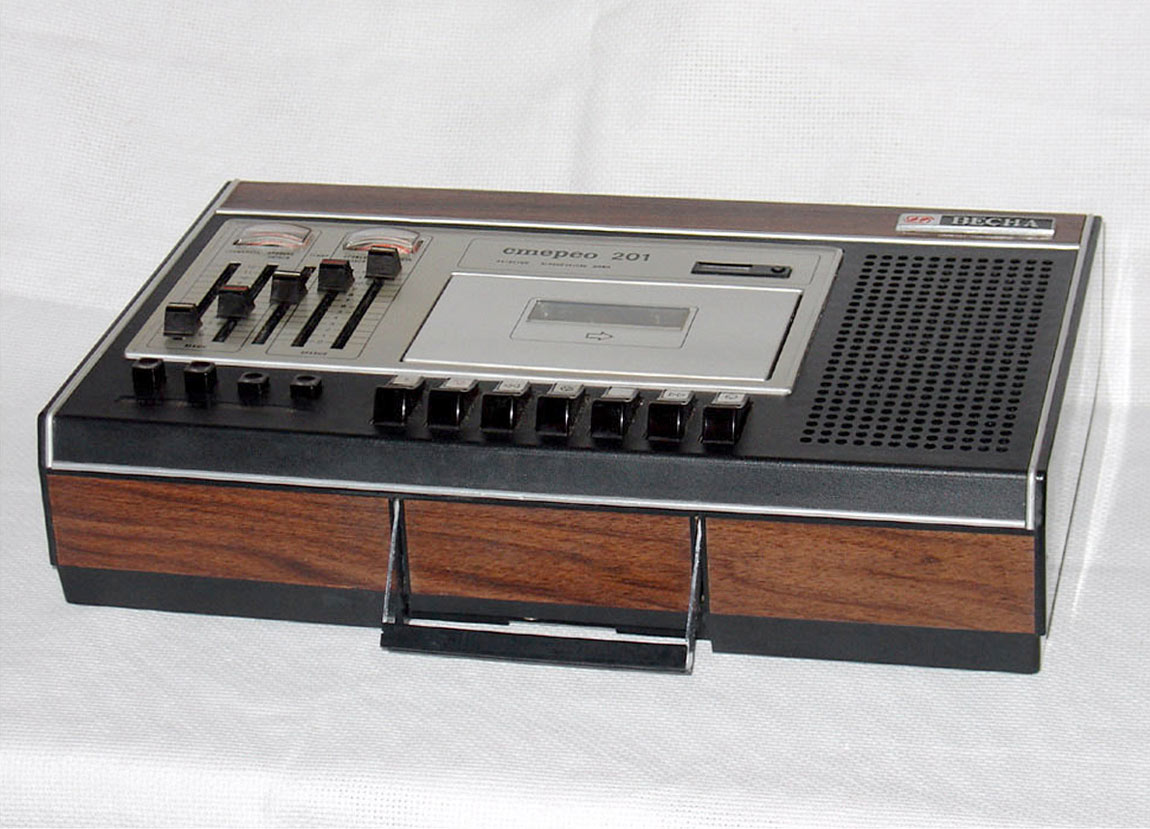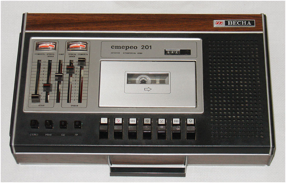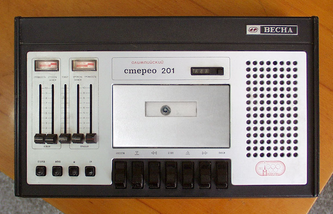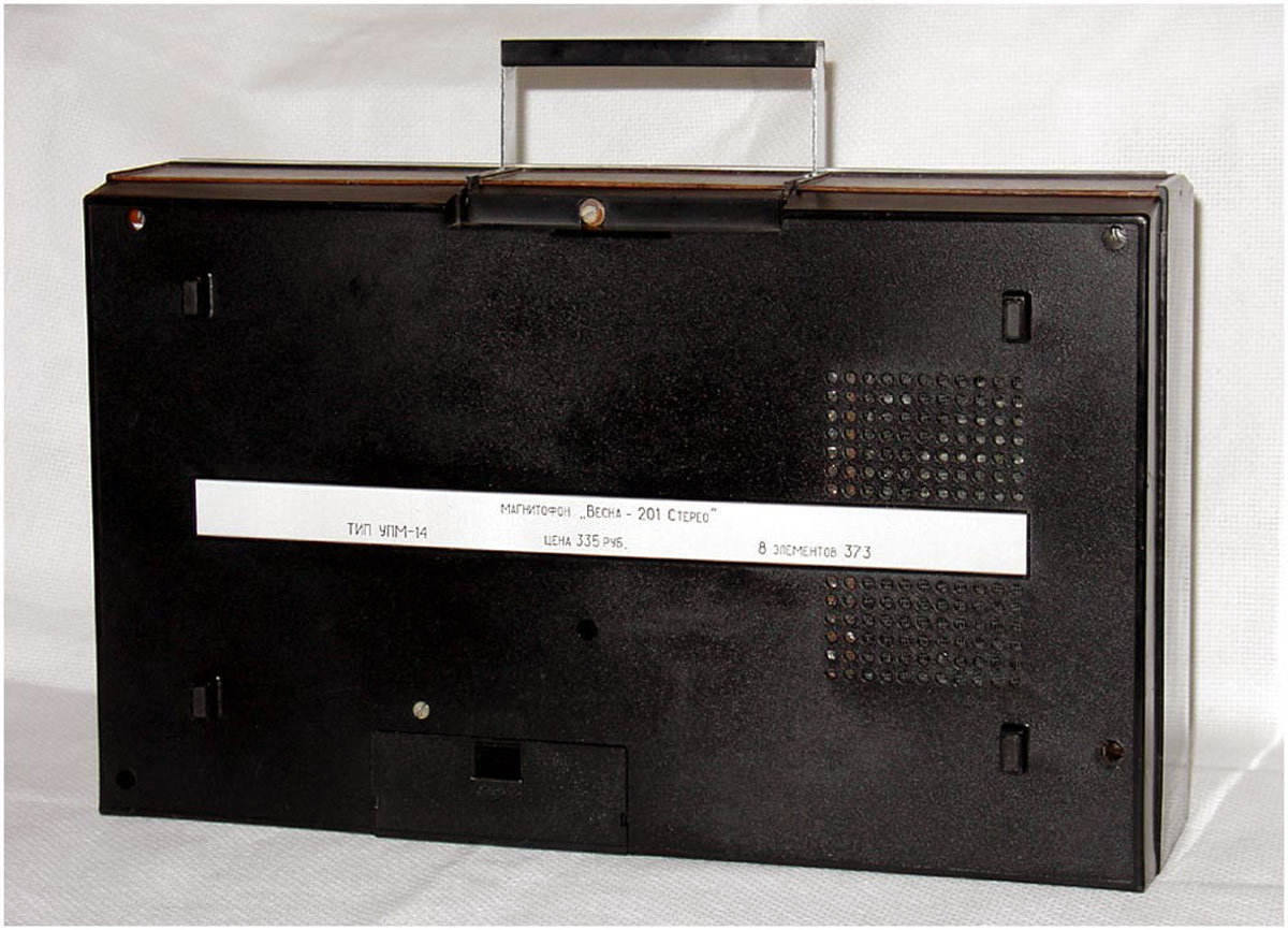 Кассетный стереофонический магнитофон *Весна-201-стерео* (УПМ-14) с 1977 года выпускал Запорожский ЭМЗ *Искра*. Магнитофон предназначен для записи и воспроизведения моно и стерофонических фонограмм. Он работает на собственный громкоговоритель как монофонический, а на выносные АС как стереофонический. Полоса воспроизводимых частот на выносных АС - 63...10000 Гц. Номинальная выходная мощность усилителей на собственную АС - 0,8 Вт, на выносные АС - 2х3 Вт. Питание 12 вольт от 8-ми элементов А-373 или от сети переменного тока через отдельный блок питания. Потребляемая мощность 30 Вт. Габариты магнитофона - 367х224х100 мм. Вес 4,7 кг. В преддверии Олимпийских игр с 1978 года к наименованию добавили атрибут **олимпийский**. Соответственно увеличилась и розничная цена магнитофона. До 1978 года футляр магнитофона по бокам и сзади наверх был оклеен декоративной плёнкой под дерево, а с 1978 года он выпускался только в пластмассе, с добавлением алюминевого оформления.