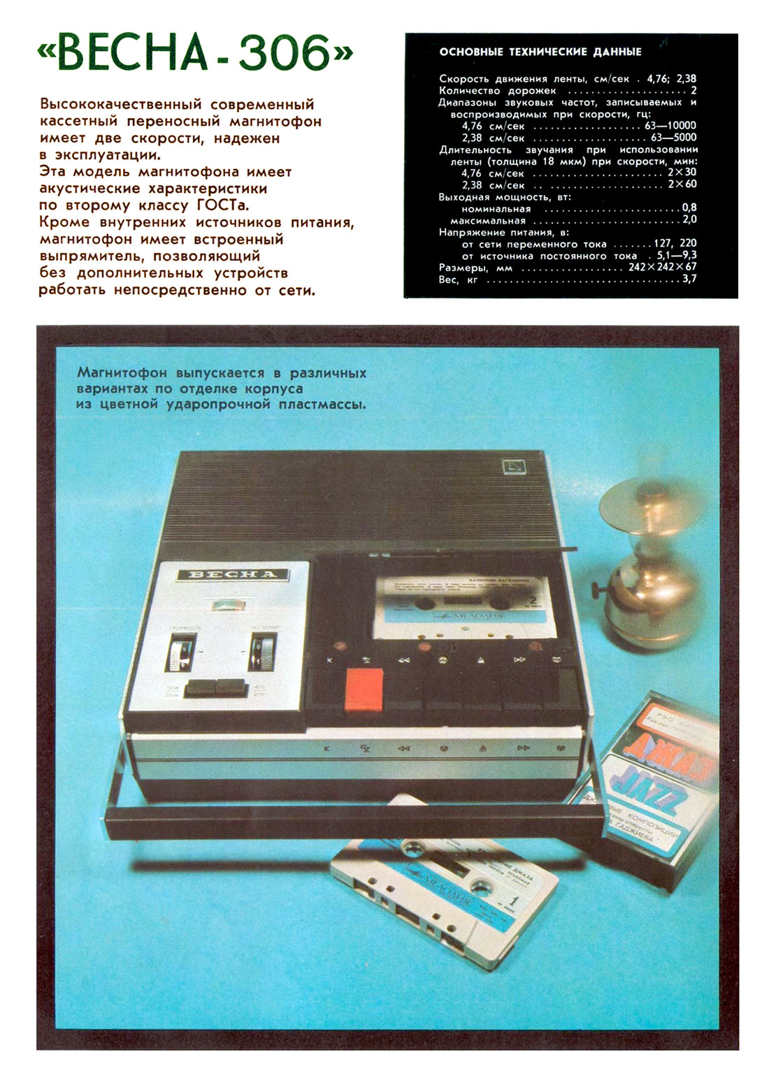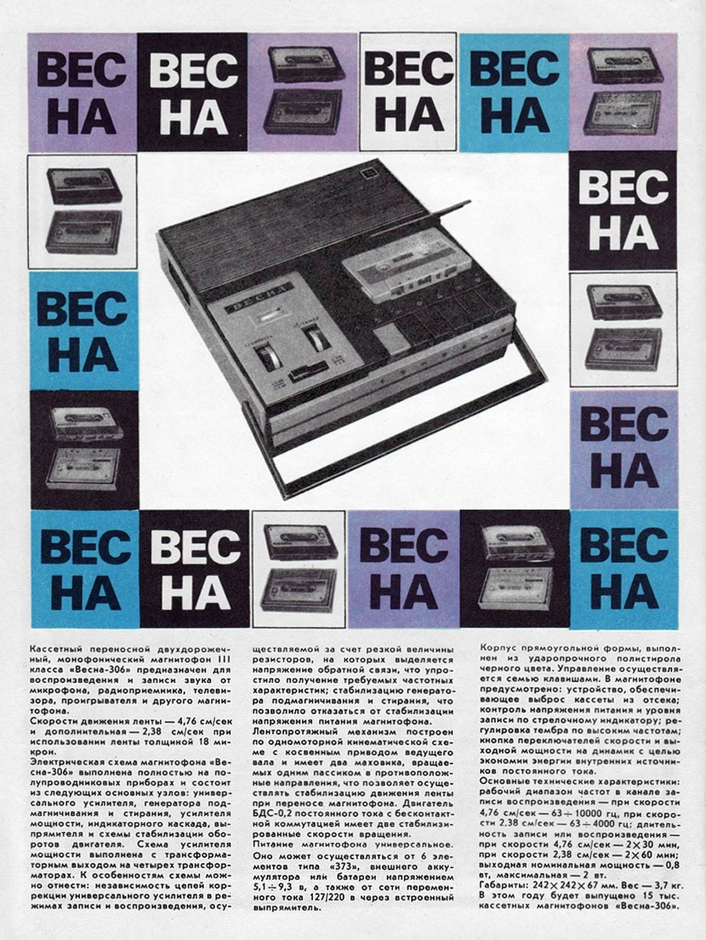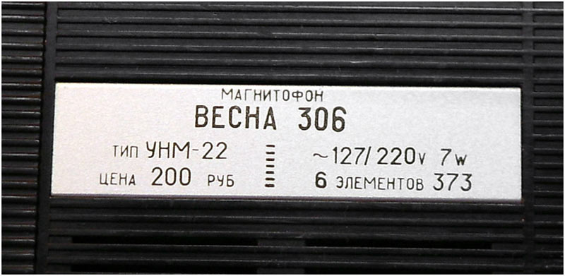 Кассетный магнитофон *Весна-306* с 1972 года выпускал Запорожский ЭМЗ *Искра* и его один филиал. Магнитофон зарекомендовал себя, как один из лучших отечественных кассетных магнитофонов в своём классе. В магнитофоне использован оригинальный ЛПМ с косвенным приводом ведущего вала, работающий от нового бесконтактного электродвигателя. От всех других кассетных ЛПМ его отличает наличие 2-х маховиков, связанных общим пассиком, что исключает колебания скорости магнитной ленты при работе в транспорте и на ходу. Конструкция узла перемотки с фрикционным роликом исключает обрыв магнитной ленты и обеспечивает надежное сцепление с маховиком, а так же с подающим и приёмным узлами при перемотке. К достоинствам следует отнести и чёткую фиксацию кассеты, что делает неизменной АЧХ. В ЛПМ имеется устройство блокировки записи. Электрическая часть магнитофона выполнена на современных транзисторах, имеет тембр по ВЧ, индикатор уровня записи и контроля питания, переключатель выходной мощности на два положения и ещё ряд других удобств. Всё описанное актуально и для магнитофона *Весна-305*, но магнитофон *Весна-306* по замыслу конструкторов должен быть стать первым. С осени 1972 года магнитофон *Весна-306* выпускал и Пермский электроприборный завод, но им всего было выпущено около 3000 аппаратов.