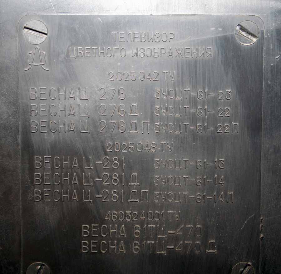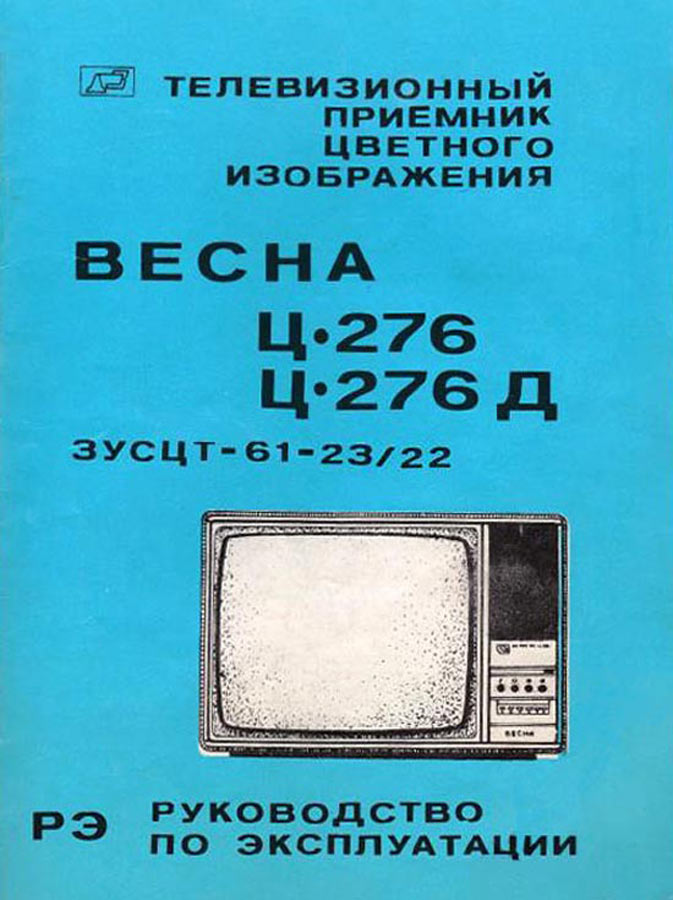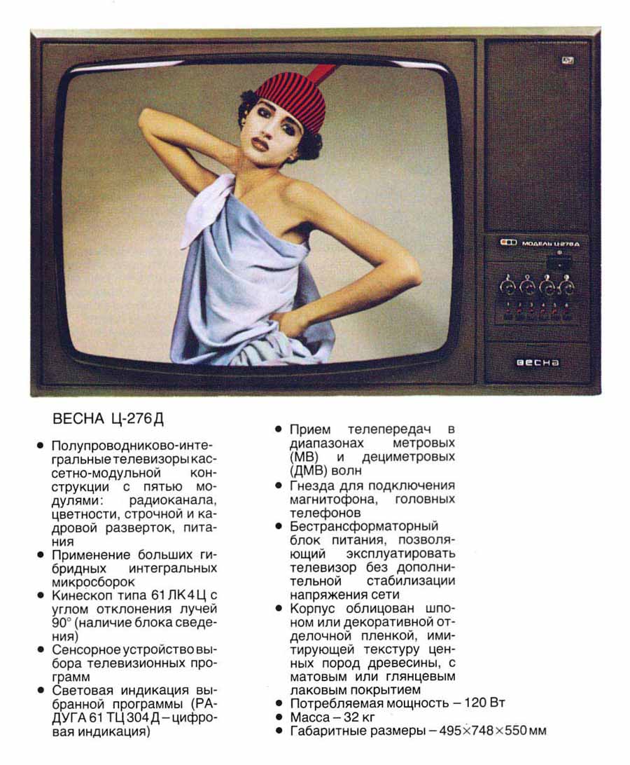 Телевизионный приёмник цветного изображения *Весна Ц-276/Д* С I-кв 1986 года выпускал Днепропетровский радиозавод. Унифицированный цветной телевизионный приёмник второго класса марки **Весна Ц-276Д** (3УСЦТ-61-23/22) собран полностью на полупроводниково-интегральных элементах и рассчитан на приём программ цветного или чёрно-белого изображения в MB и ДМВ (индекс *Д*) диапазонах волн. В телевизоре установлен кинескоп типа *61ЛК4Ц* с размером диагонали экрана 61 см. Выбор программ сенсорный, со световой индикацией работающей программы. Телевизор снабжён разъёмом для включения головных телефонов и магнитофона на запись звукового сопровождения, устройством сопряжения с видеомагнитофоном по низкой частоте. В телевизоре имеется сервисный разъём для подключения диагностического тестера. Чувствительность по каналу изображения: MB 55, ДМВ 90 мкВ. Максимальная мощность канала звука 2,5 Вт. Диапазон частот звука 80...12000 Гц. Потребляемая мощность 120 Вт. Размеры телевизора 753 х 485 х 550 мм. Масса 36 кг. Цена телевизора 720, с индексом *Д* - 755 рублей.