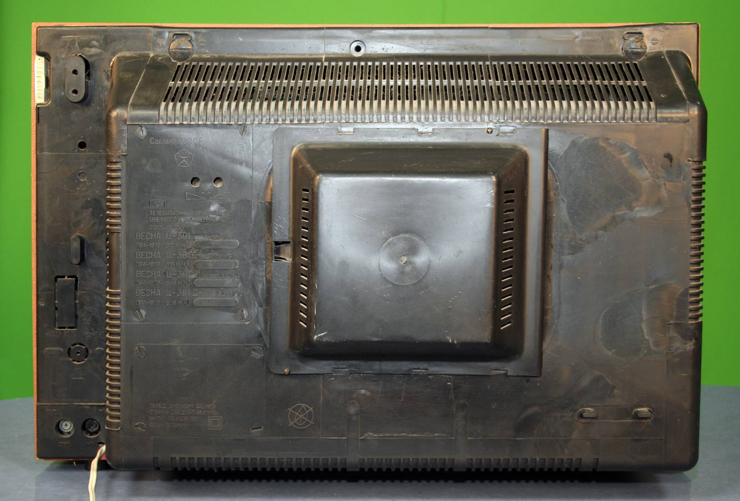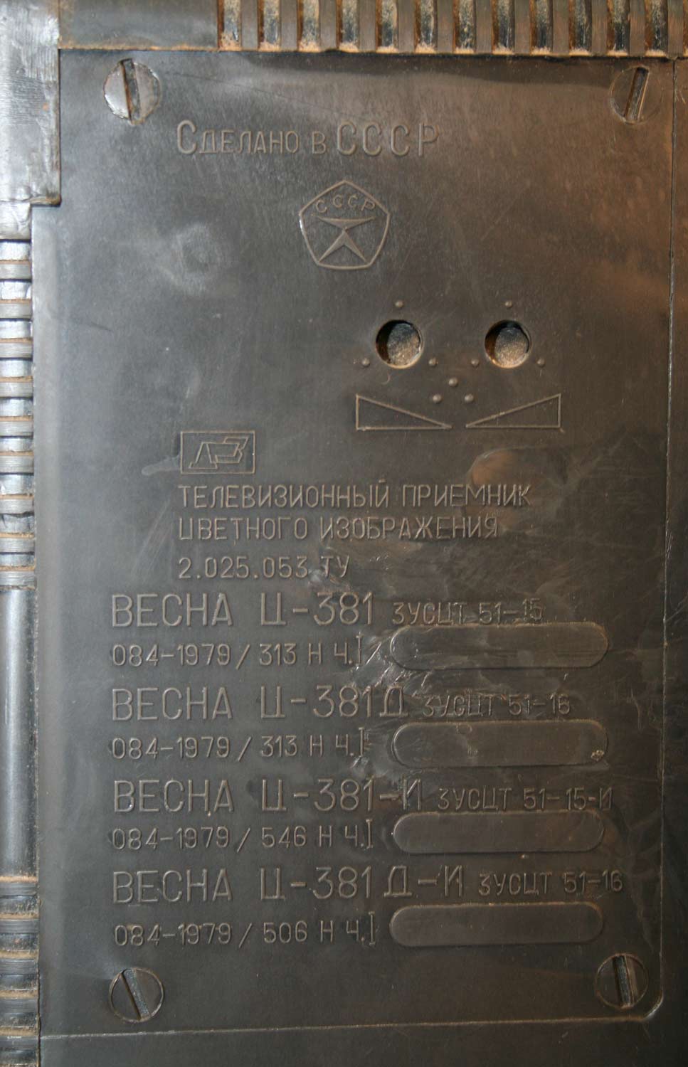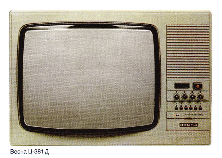 Телевизионный приёмник цветного изображения *Весна Ц-381/Д* с I-кв 1985 года выпускало Днепропетровское ПО *Весна*. *Весна Ц-381/Д* - полупроводниково-интегральный телевизор кассетно-модульной конструкции с 5 модулями: радиоканала, цветности, строчной и кадровой разверток, питания. Кинескоп типа 51ЛК2Ц с самосведением и углом отклонения лучей в 90°. Сенсорное устройство выбора телевизионных программ со световой индикацией выбранной программы. Приём телепередач в диапазоне метровых (МВ) волн. Телевизоры с индексом *Д* осуществляют приём телепередач в диапазонах МВ и ДМВ. Имеются гнёзда подключения магнитофона и головных телефонов. Применён бестрансформаторный БП, позволяющий эксплуатировать телевизор без стабилизации напряжения сети. Корпус ТВ облицован декоративной отделочной пленкой или пенополиуретаном. Потребляемая мощность 75 Вт. Габаритные размеры телевизора 470х640х445 мм. Масса 27 кг.