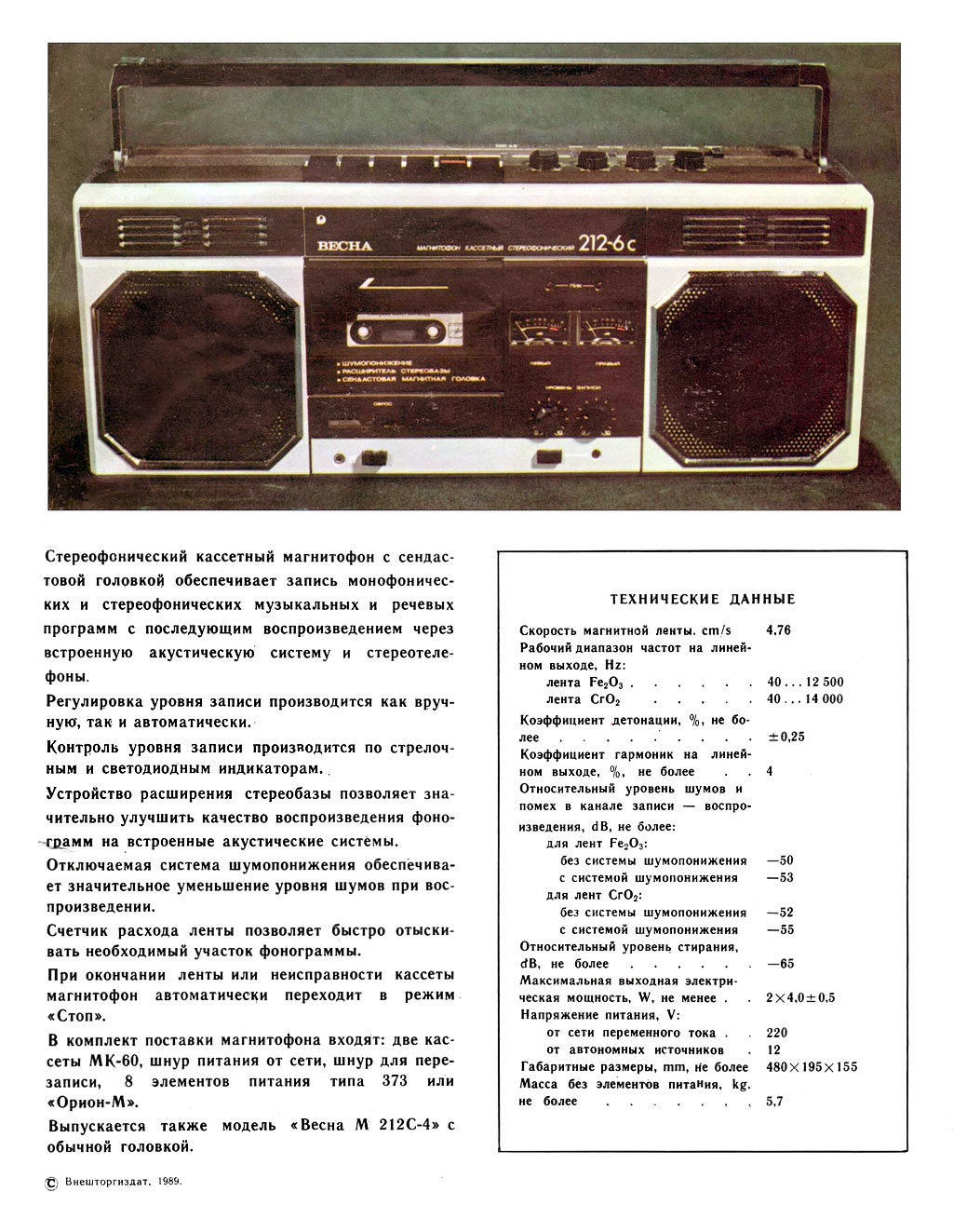 Портативный стереофонический кассетный магнитофон *Весна М-212С-6* с 1988 года выпускали Запорожский завод магнитофонов *Весна* и электромашиностроительный завод *Искра*. Магнитофон выпускался совместно с моделью *Весна М-212-4* и отличался только установленной сендастовой головкой, так как поставлялся на экспорт в ряд социалистических стран.