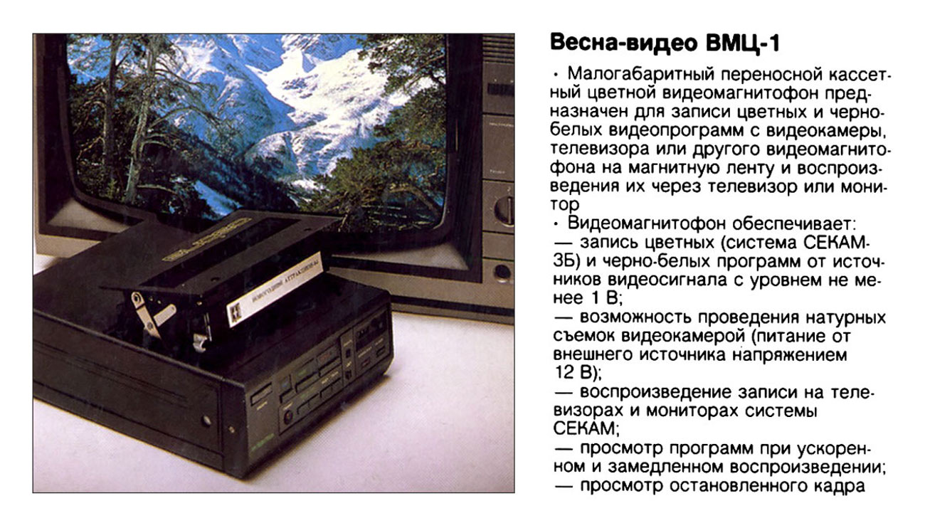 Кассетный видеомагнитофон *Весна-видео ВМЦ-1* опытно выпущен в 1988 году Запорожским электромашиностроительным заводом *Искра*. ВМ создан на основе ЛПМ от видеомагнитофона *Электроника ВМ-12* и является частичной копией видеомагнитофонов *National NV-100* и *Panasonic NV-8420*. Видеомагнитофон *Весна-видео ВМЦ-1* имеет облегчённую, удобную для переноски конструкцию и не имеет телевизионного тюнера. В Киргизии, на Фрунзенском заводе *ЭВМ* в 1988 году так же был опытный выпуск видеомагнитофона, но под наименованием *Иссык-Куль ВМЦ-1*. В том же 1988 году Государственная приёмочная комиссия Минторга СССР из-за несоответствия стандартам на подобный класс запретила серийный выпуск этих моделей.