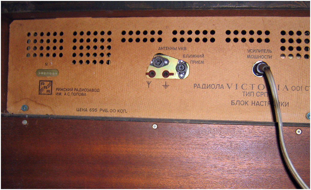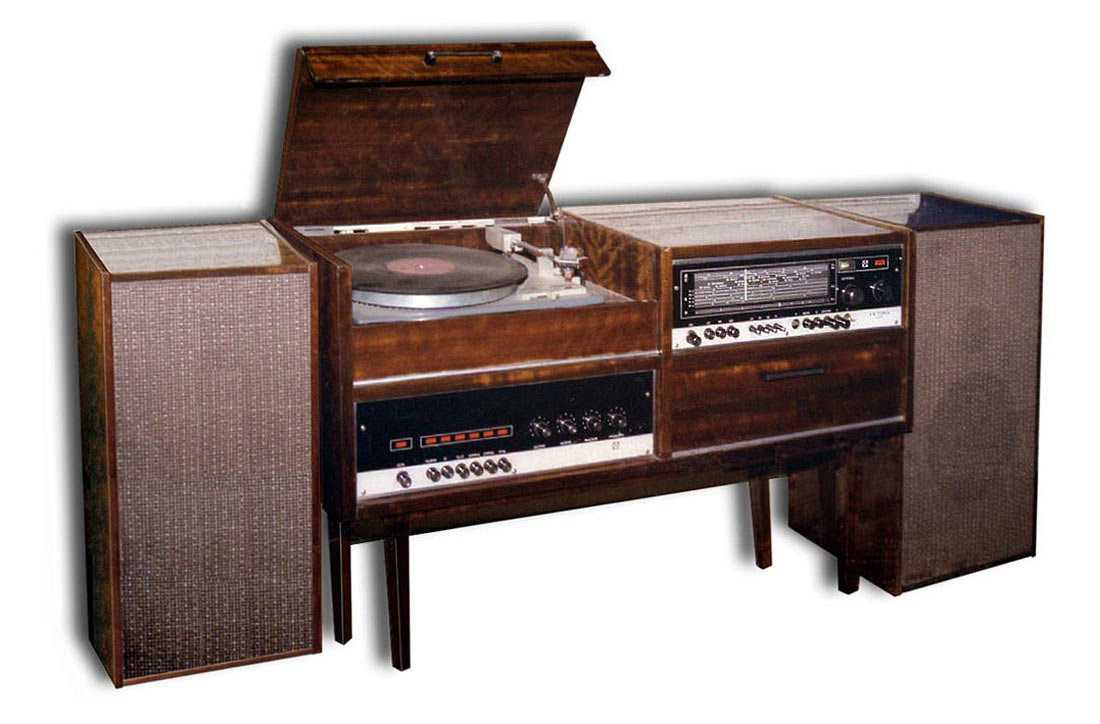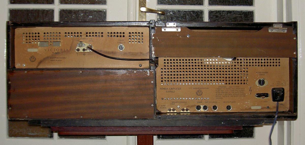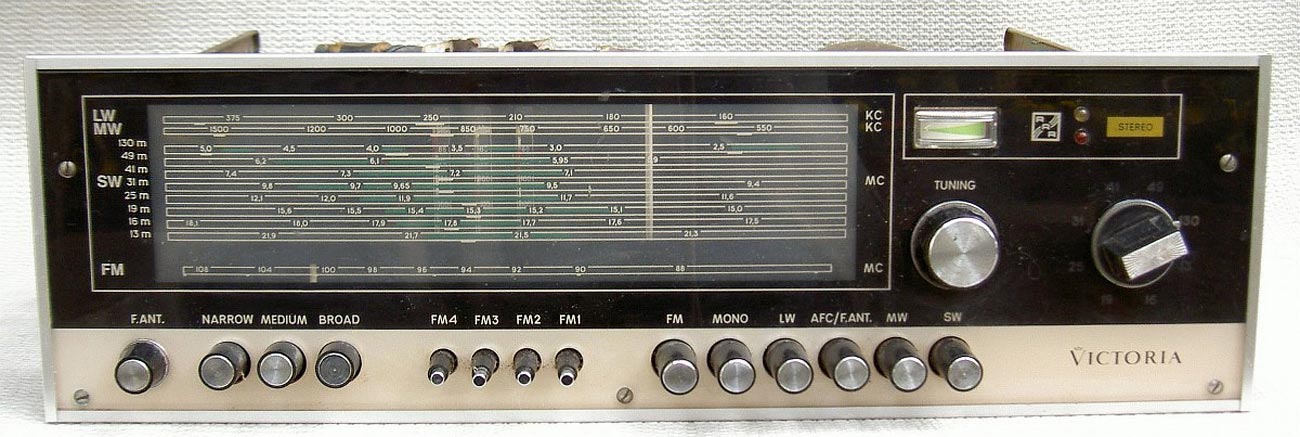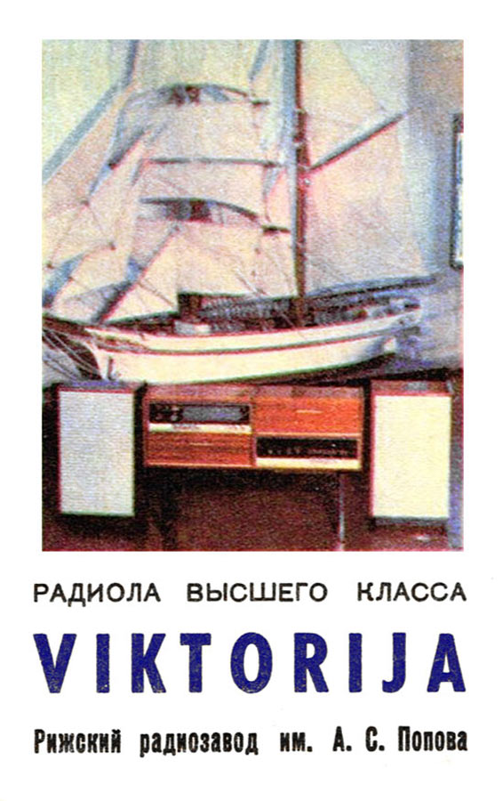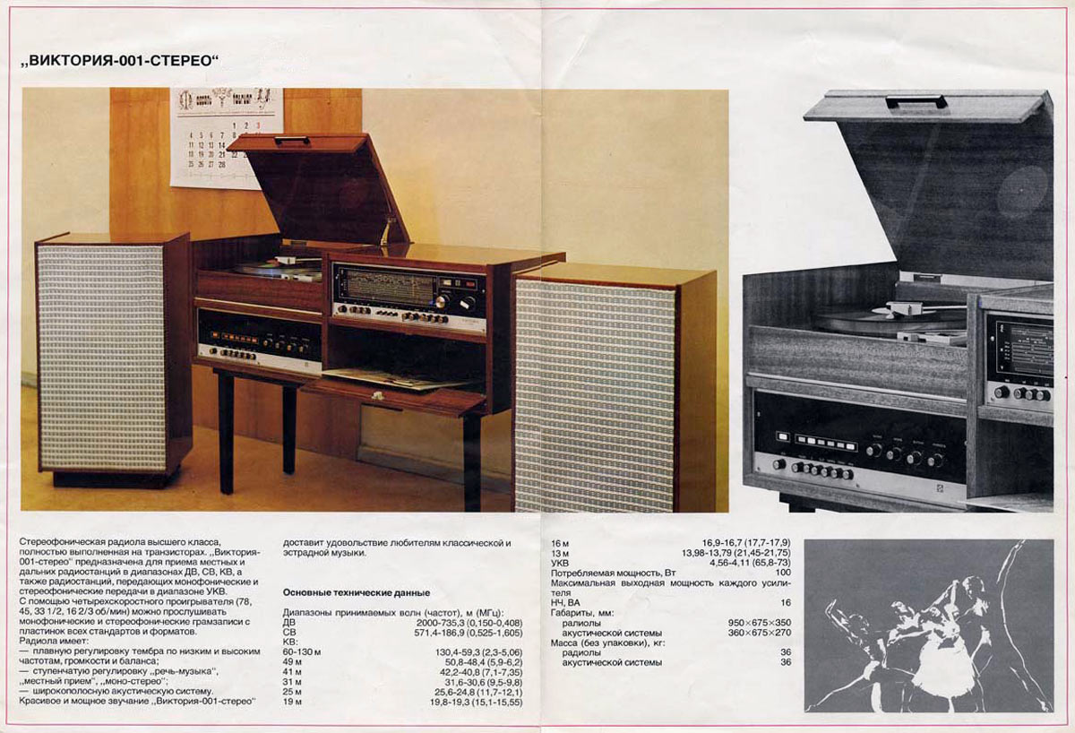 Стационарная транзисторная радиола *Виктория-001-стерео* с осени 1972 года выпускалась на Рижском радиозаводе имени А.С.Попова. Стереофоническая радиола высшего класса **Виктория-001-стерео** - имела консольное или полочное оформление, поэтому перед цифрами 001 стоял индекс К или Н. На фото слева консольный вариант модели. Радиола предназначена для приёма монофонических радиопрограмм в диапазонах ДВ, СВ, пяти поддиапазонах KB и УКВ, стереофонических передач в диапазоне УКВ-ЧМ, а также для прослушивания записи с моно и стереофонических грампластинок. В радиоле имеется ступенчатая регулировка полосы пропускания в диапазонах ДВ, СВ и КВ, фиксированная настройка на одну из трёх станций и автоматическая подстройка частоты в УКВ-ЧМ диапазоне, фиксированное положение местный приём, тонкомпенсированная регулировка уровня громкости, плавная регулировка тембра для высших и низших звуковых частот, фиксированное положение тембров при прослушивании речевых передач, регулировка стереобаланса и стрелочная индикация настройки на станцию. В радиоле используется четырёхскоростное ЭПУ I-ЭПУ-73С с электромагнитным звукоснимателем. Чувствительность с наружной антенной в диапазонах ДВ, СВ, KB - 50 мкВ, в диапазоне УКВ-ЧМ - 2,5 мкВ. С магнитной антенной в диапазонах ДВ 2 мВ/м и СВ 1,5 мВ/м. Избирательность в диапазонах ДВ и СВ - 60 дБ. Номинальная выходная мощность усилителя НЧ 2х4 Вт, максимальная 2х16 Вт. Полоса звуковых частот тракта AM 40...6300 Гц, тракта ЧМ и грамзаписи 40...16000 Гц. В каждой из акустических систем радиолы установлено по три громкоговорителя типов: 8ГД-1, 4ГД-8 и ЗГД-2. Радиола выполнена в виде автономных блоков, каждый из которых имеет собственный источник питания. Размеры блока настройки, усилителя мощности и проигрывателя одинаковы 457х315х175 мм, вес соответственно - 10.5, 11.5 и 10.6 кг. Консольная радиола имеет размеры - 974х672х350 мм. Размеры одной акустической системы - 672х350х270 мм, вес - 18 кг.