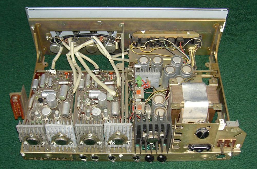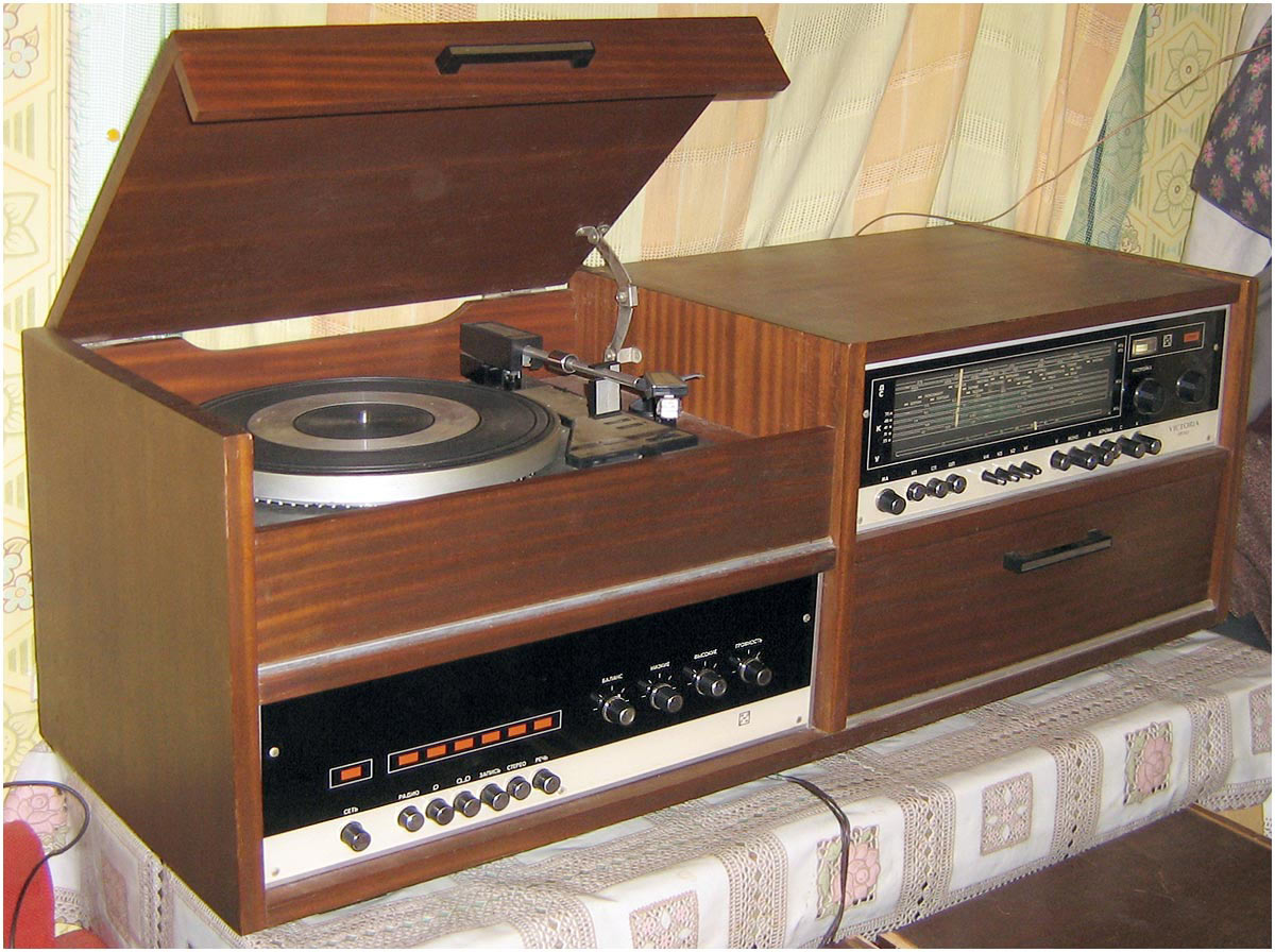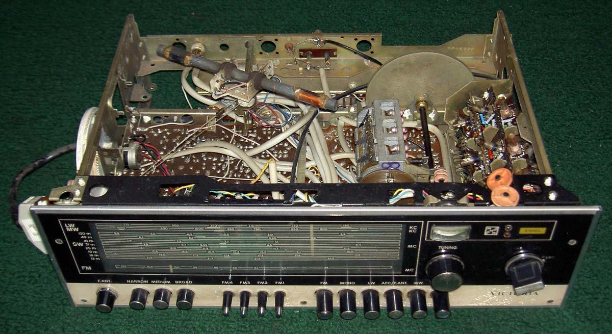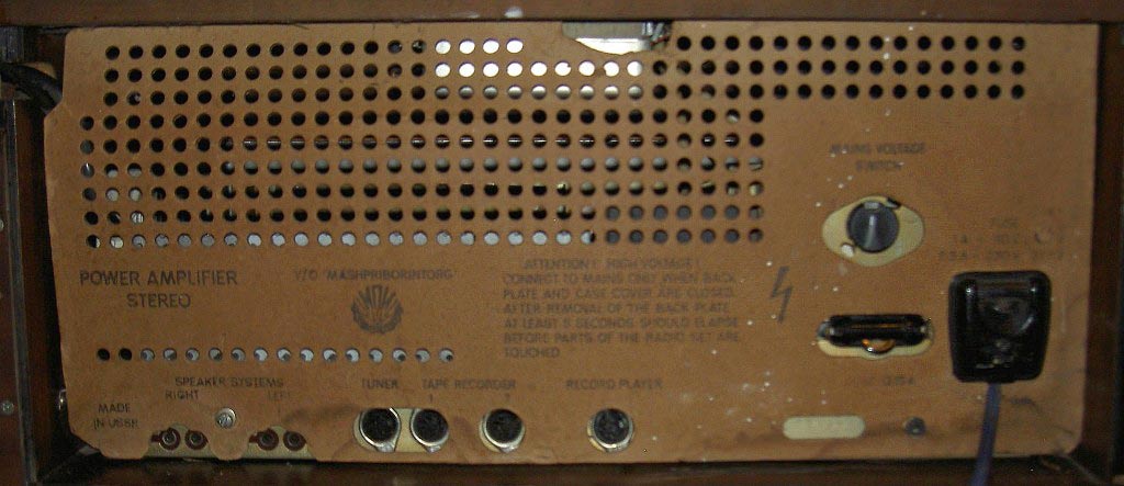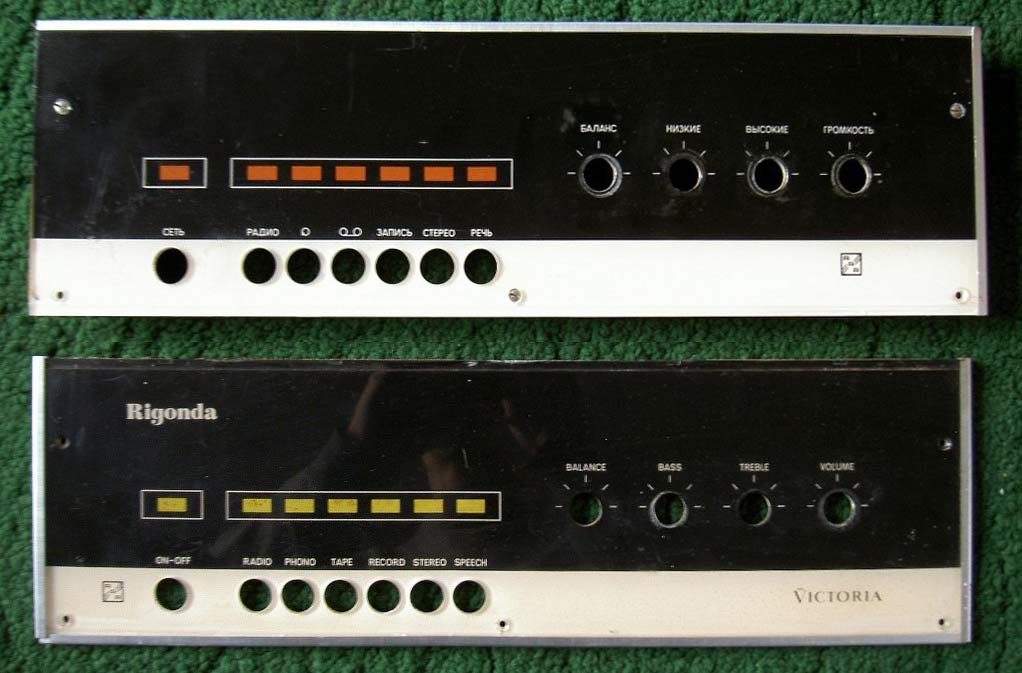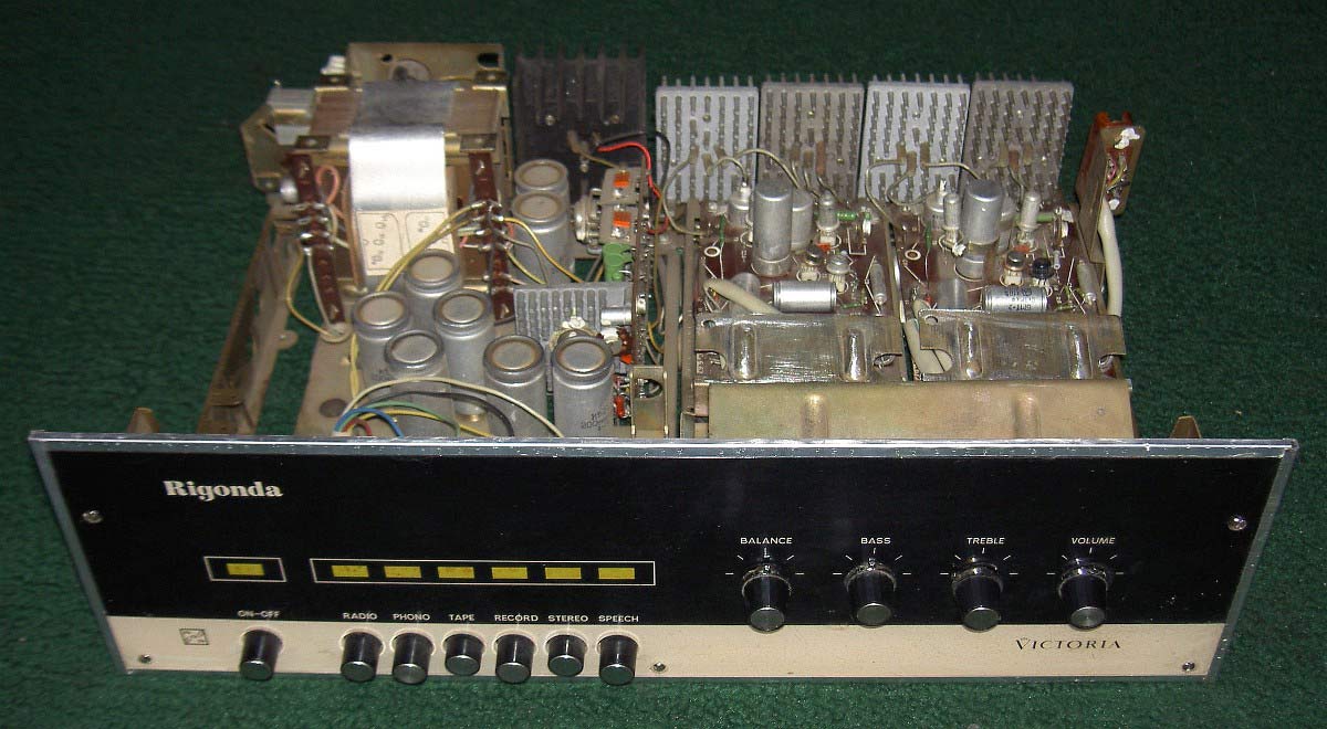Стационарная транзисторная радиола *Виктория-001-стерео* с осени 1972 года выпускалась на Рижском радиозаводе имени А.С.Попова. Стереофоническая радиола высшего класса **Виктория-001-стерео** - имела консольное или полочное оформление, поэтому перед цифрами 001 стоял индекс К или Н. На фото слева консольный вариант модели. Радиола предназначена для приёма монофонических радиопрограмм в диапазонах ДВ, СВ, пяти поддиапазонах KB и УКВ, стереофонических передач в диапазоне УКВ-ЧМ, а также для прослушивания записи с моно и стереофонических грампластинок. В радиоле имеется ступенчатая регулировка полосы пропускания в диапазонах ДВ, СВ и КВ, фиксированная настройка на одну из трёх станций и автоматическая подстройка частоты в УКВ-ЧМ диапазоне, фиксированное положение местный приём, тонкомпенсированная регулировка уровня громкости, плавная регулировка тембра для высших и низших звуковых частот, фиксированное положение тембров при прослушивании речевых передач, регулировка стереобаланса и стрелочная индикация настройки на станцию. В радиоле используется четырёхскоростное ЭПУ I-ЭПУ-73С с электромагнитным звукоснимателем. Чувствительность с наружной антенной в диапазонах ДВ, СВ, KB - 50 мкВ, в диапазоне УКВ-ЧМ - 2,5 мкВ. С магнитной антенной в диапазонах ДВ 2 мВ/м и СВ 1,5 мВ/м. Избирательность в диапазонах ДВ и СВ - 60 дБ. Номинальная выходная мощность усилителя НЧ 2х4 Вт, максимальная 2х16 Вт. Полоса звуковых частот тракта AM 40...6300 Гц, тракта ЧМ и грамзаписи 40...16000 Гц. В каждой из акустических систем радиолы установлено по три громкоговорителя типов: 8ГД-1, 4ГД-8 и ЗГД-2. Радиола выполнена в виде автономных блоков, каждый из которых имеет собственный источник питания. Размеры блока настройки, усилителя мощности и проигрывателя одинаковы 457х315х175 мм, вес соответственно - 10.5, 11.5 и 10.6 кг. Консольная радиола имеет размеры - 974х672х350 мм. Размеры одной акустической системы - 672х350х270 мм, вес - 18 кг.