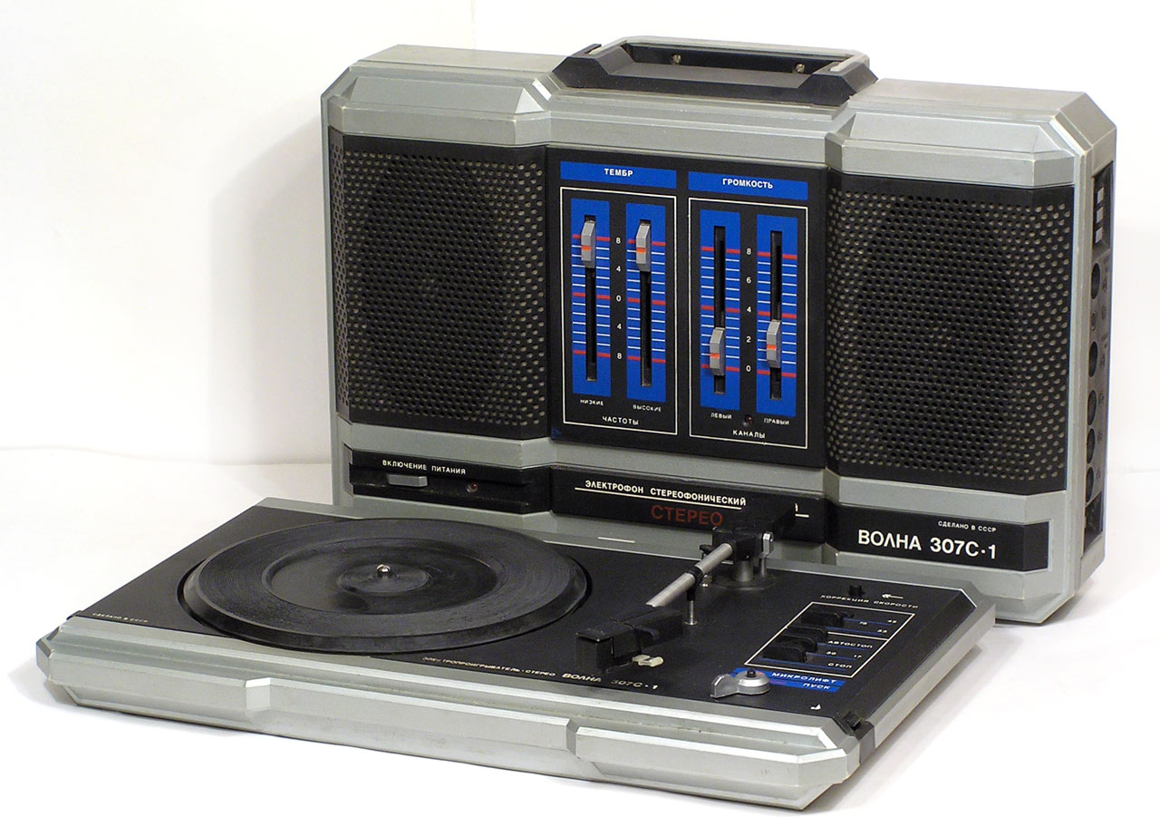 Электрофон транзисторный *Волна ЭФ-307-С-1* с I-кв 1991 года выпускало Саратовское ПО *Корпус*. Электрофон с универсальным питанием *Волна ЭФ-307С-1* предназначен для прослушивания механической записи со стерео и монофонических грампластинок всех форматов. Привод диска прямой, от специального тихоходного электродвигателя. В электрофоне имеется регулировка тембра НЧ и ВЧ, возможность расширения стереобазы. Питание универсальное, от сети или от 6-ти элементов 343. Частота вращения диска 33 об/мин. Коэффициент детонации 0,2%. Номинальная выходная мощность УЗЧ - 2х1,5 Вт. Диапазон частот, воспроизводимых АС - 100...10000 Гц. Потребляемая от сети мощность 8 Вт, от батарей 3,5 Вт. Габариты электрофона 480х260х118 мм. Его масса 6,5 кг. Цена 120 рублей.