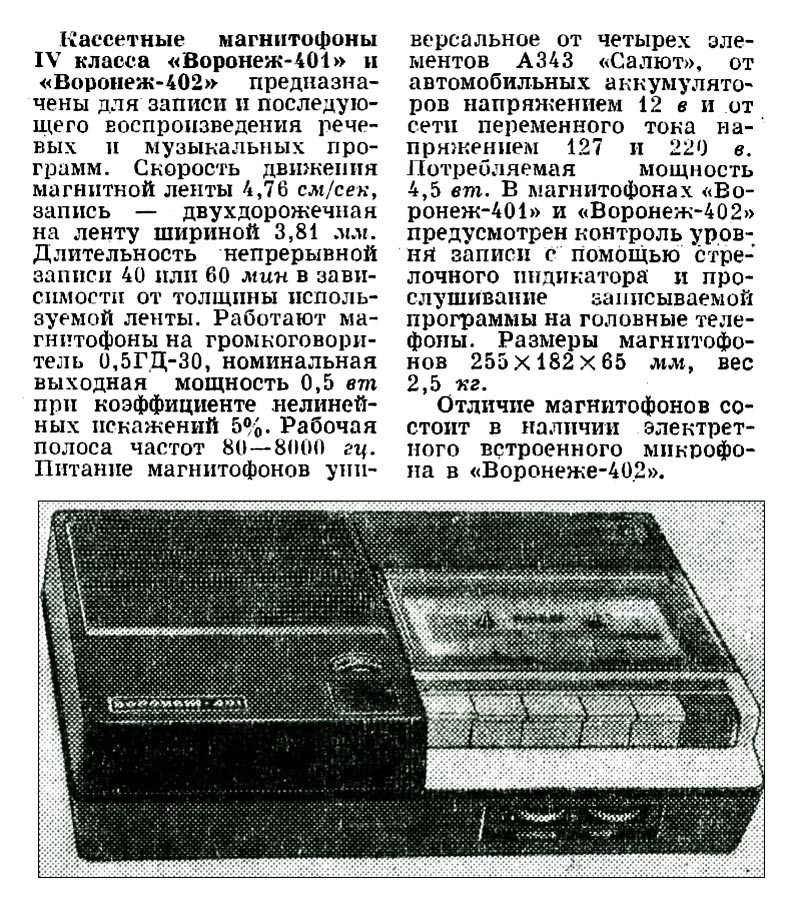 Кассетные магнитофоны *Воронеж*, *Воронеж-401*, *402*, *403* и *404* с 1970, 1971, 1972, 1973 и 1974 года выпускал Нововоронежский завод *Алиот*. Кассетный магнитофон четвёртого класса **Воронеж** создан в 1970 году и был выпущен небольшой серией. На его основе выпускались остальные модели **Воронеж-401*, *402*, *403* и *404**. Любой магнитофон предназначен для записи и воспроизведения звуковых фонограмм. Скорость движения ленты 4,76 см/сек. Работают все магнитофоны на эллипсный громкоговоритель типа 0,5ГД-30 (в магнитофоне *Воронеж* был применён круглый громкоговоритель 0,5ГД-12). Номинальная выходная мощность 0,5 Вт, при коэффициенте нелинейных искажений 5%. Полоса рабочих частот 80...8000 Гц. Питание универсальное, от 6-ти элементов А-343 или от сети через встроенный БП. Потребляемая мощность 4,5 Вт. Для всех магнитофонов имеется контроль уровня записи с помощью стрелочного индикатора и контроль записываемой программы на головные телефоны. Размеры любого из магнитофонов 255х182х65 мм, вес 2,5 кг. Отличие магнитофонов состоит в наличии или отсутствии встроенного микрофона, блока питания и системы АРУЗ. Цена моделей 135, 145, 155, 180 и 165 рублей соответственно. Самым массовым стал магнитофон *Воронеж-404*, магнитофонов *Воронеж-403* выпущено ~ 60 тысяч, а моделей *Воронеж-401* и *Воронеж-402* намного меньшее количество.