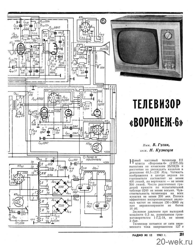 Телевизор 3-го класса *Воронеж-6* (УНТ-35) подготовил к выпуску с осени 1963 года Воронежский завод *Электросигнал*. Телевизор должен был прийти на смену моделям серии **Воронеж**. Он был выполнен по унифицированной схеме и конструкции, по которой с 1964 года производились телевизоры: **Рекорд-64**, **Рассвет**, **Аэлита**, **Снежок**, **Весна-3** и некоторые другие. Телевизор **Воронеж-6** был первым в линейке новых моделей. Он выполнен на кинескопе 35ЛК2Б и рассчитан для работы в любом из 12-ти каналов. Четкость изображения в центре экрана по горизонтали 400 линий, по вертикали 500 линий. Число различимых градаций яркости по испытательной таблице - 0249 не менее 8. Чувствительность телевизора на всех каналах 200 мкВ. Полоса воспроизводимых звуковых частот 150...5000 Гц. Телевизор питается от сети переменного тока с напряжением 127 или 220 В. Потребляемая мощность - 120 Вт. Электрическая схема телевизора разбита на несколько функциональных блоков, что позволяет производить их предварительную регулировку перед сборкой. Переключатель телевизионных каналов ПТК-5С отличается надежностью, малой потребляемой мощностью и новыми ПЧ. Радио №12/1963 ст.20