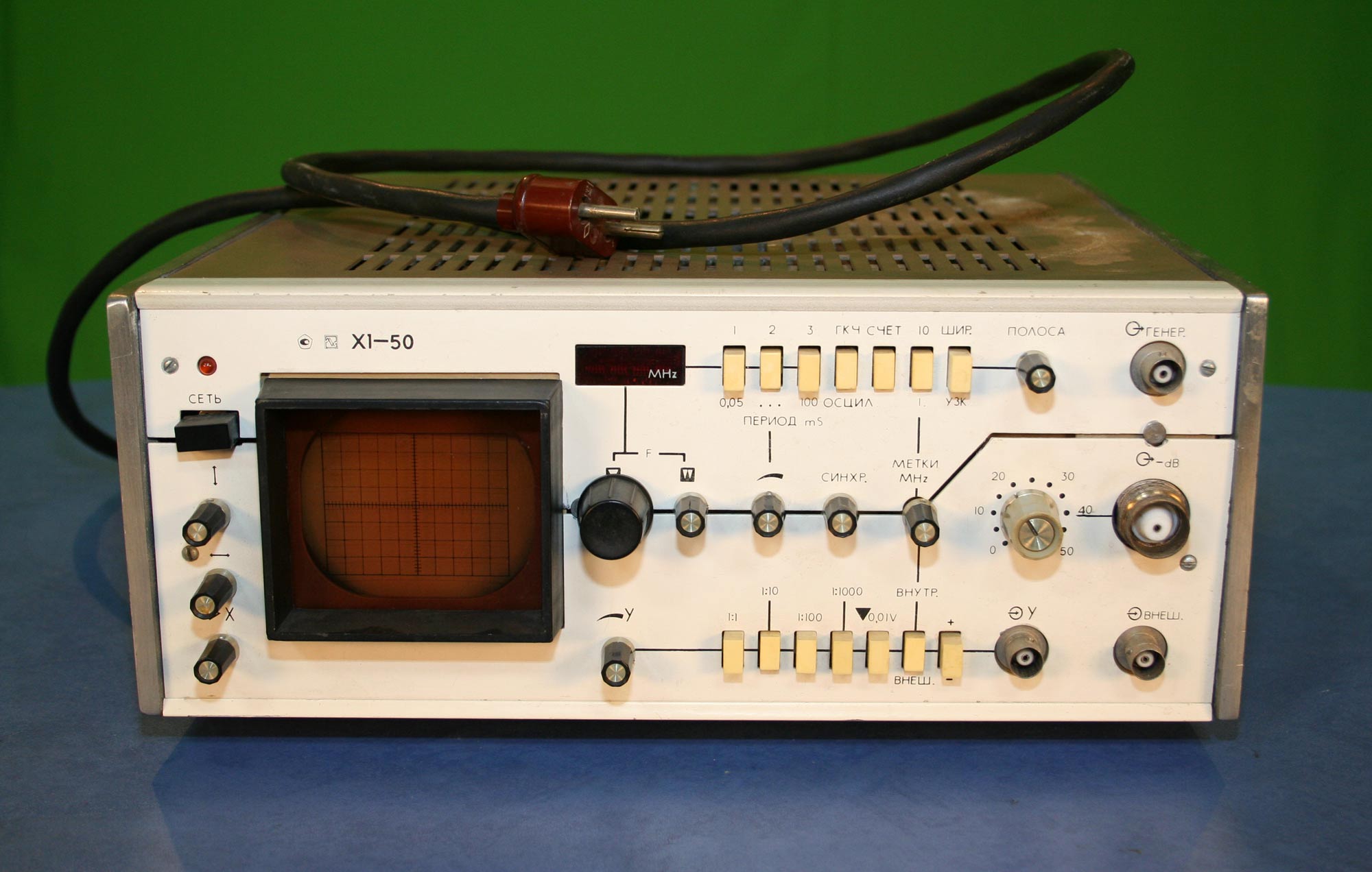 Измеритель АЧХ *Х1-50* выпускался с 1985 года Курским заводом *Маяк*. Предназначен для исследования и настройки АЧХ ВЧ и СВЧ узлов с воспроизведением АЧХ на экране ЭЛТ. *Х1-50* заменяет прибор *Х1-7Б* и обладает рядом преимуществ в сравнении с ним: перекрывает весь диапазон частот до 100МГц, имеет широкополосный режим качания, выходное напряжение ГКЧ во всем рабочем диапазоне частот 100мВ, высокую чувствительность канала вертикального отклонения. Диапазон частот, МГц 0.36-436;4 34-636; 636-1002. Полоса качания частоты (МГц): В узкополосном режиме 0,5, в широкополосном режиме 20. Частотные метки Через 1 и 10 МГц. Выходное напряжение ГКЧ, мВ 100. Пределы изменения выходного напряжения, дБ 0-50. Потребляемая мощность, ВА 70. Габариты, мм 308х304х133. Масса, кг 8.5.