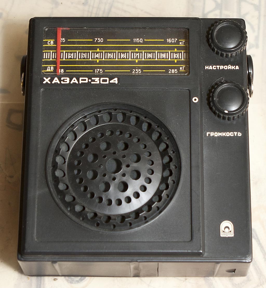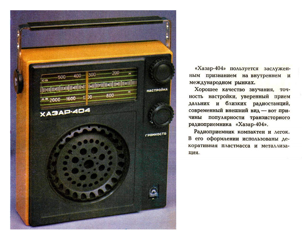 Портативные радиоприёмники *Хазар-404* и *Хазар-304* соответственно с 1984 и 1986 года выпускал Бакинский радиозавод. Радиоприёмники, кроме наименования и оформления шкалы - одинаковы и повышение класса обусловлено повышением заинтересованности потенциальных покупателей. Любой из радиоприёмников предназначен для приёма радиовещательных станций в диапазоне ДВ, СВ на внутреннюю магнитную антенну. Питание осуществляется от шести элементов А-343 или двух батарей 3336Л. Имеется возможность для подключения внешней антенны, головных телефонов и внешнего источника питания. Основные характеристики: чувствительность в диапазоне ДВ - 2, СВ - 1,5 мВ/м; селективность по соседнему каналу - 30 дБ; номинальная выходная мощность не менее 300, максимальная 500 мВт; номинальный диапазон воспроизводимых звуковых частот 250...3550 Гц; мощность, потребляемая от батареи питания 0,8 Вт. Габариты любого радиоприёмника - 182 х 200 х 73 мм. Масса без источников питания 0,9 кг.