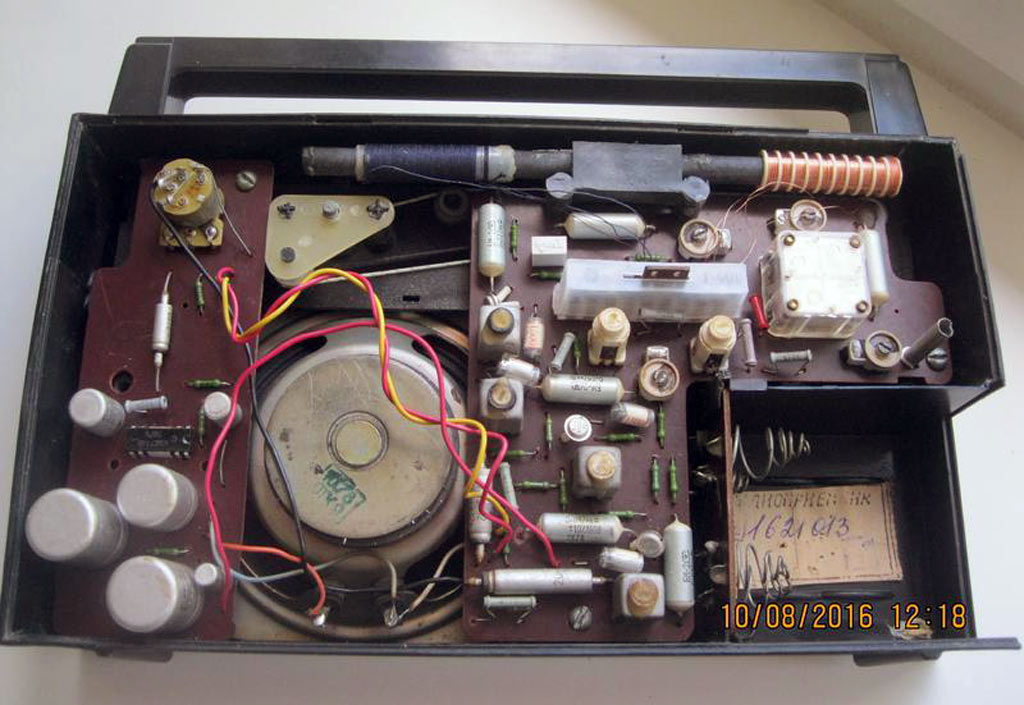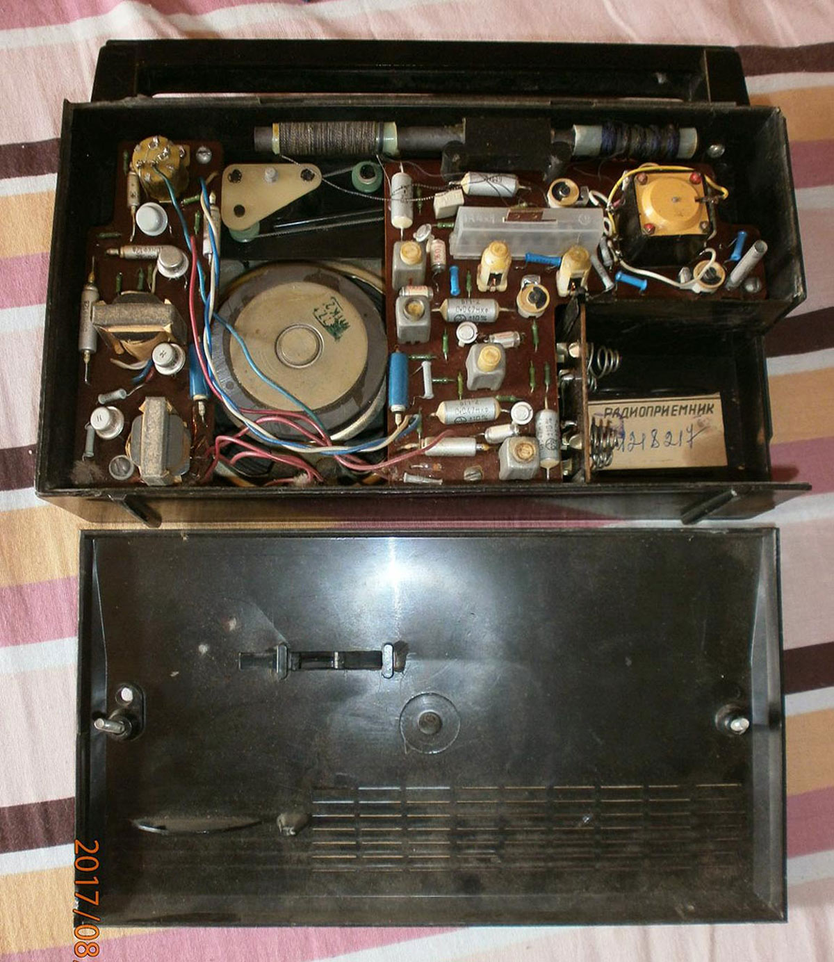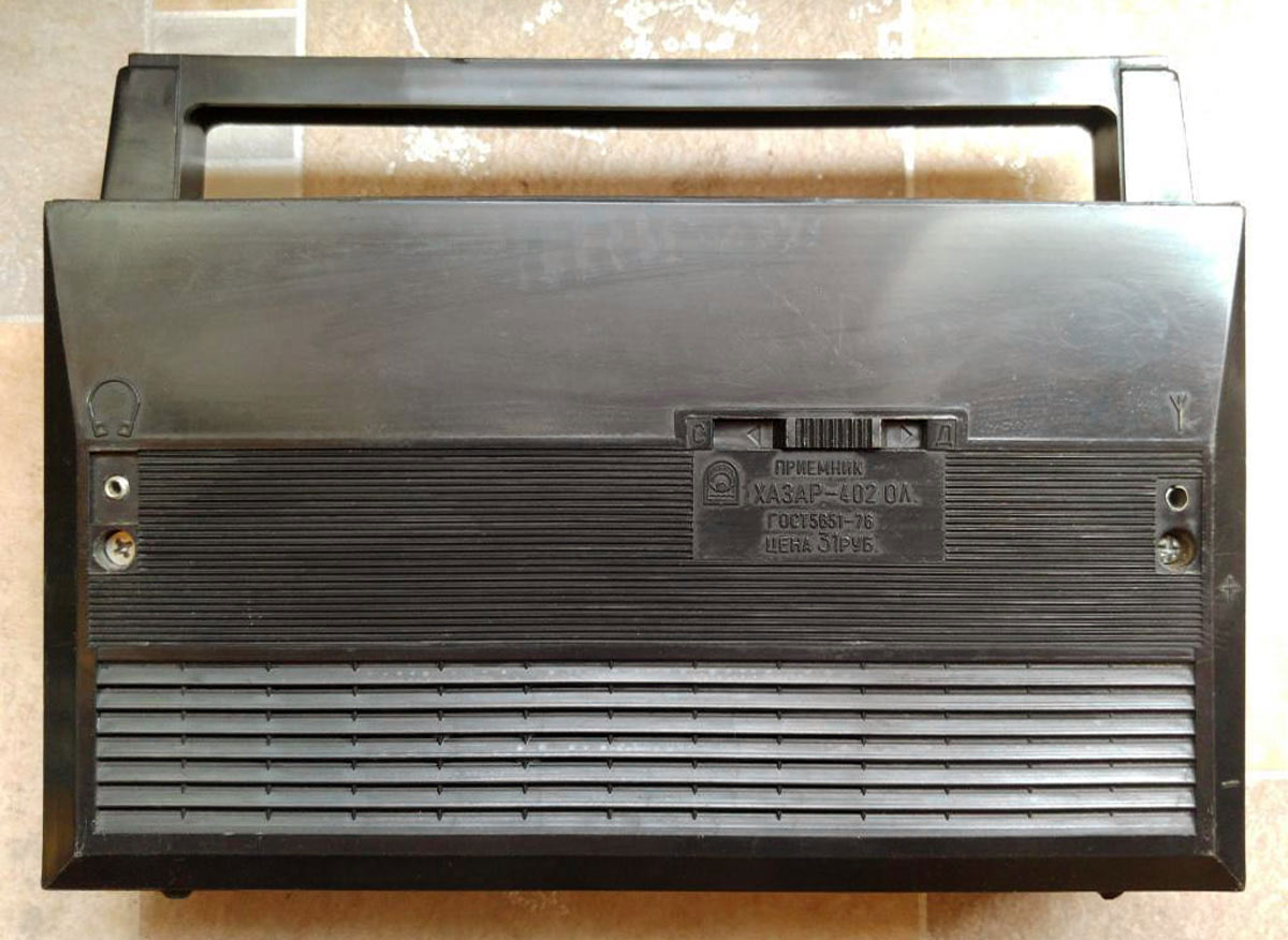 Портативный радиоприёмник *Хазар-402* с 1975 года выпускал Бакинский радиозавод. **Хазар-402** (в переводе с азербайджанского языка - Каспий. Каспийское море) - радиоприёмник 4-го класса супергетеродинного типа, предназначенный для приёма радиовещательных станций в диапазонах СВ и ДВ. Чувствительность 0,8 мВ в СВ и 1,5 мВ/м в ДВ диапазоне. Селективность по соседнему каналу 20 дБ. Номинальная выходная мощность 150 мВт, максимальная 250 мВт. Диапазон воспроизводимых звуковых частот 315...3550 Гц. Питание от двух батарей 3336Л. По электрической схеме, конструкции и параметрам приёмник схож с моделью **Хазар-401**, использован лишь его немного изменённый футляр. Цена радиоприёмника 29 рублей. Радиоприёмник с Олимпийской символикой стоил 31 рубль. Радиоприёмник планировали выпускать в чехле из кожзаменителя, но не выпускали. В некоторых партиях радиоприёмников *Хазар-402* экспериментально применяли усилители НЧ на микросхеме К174УН4Б (10-е фото).