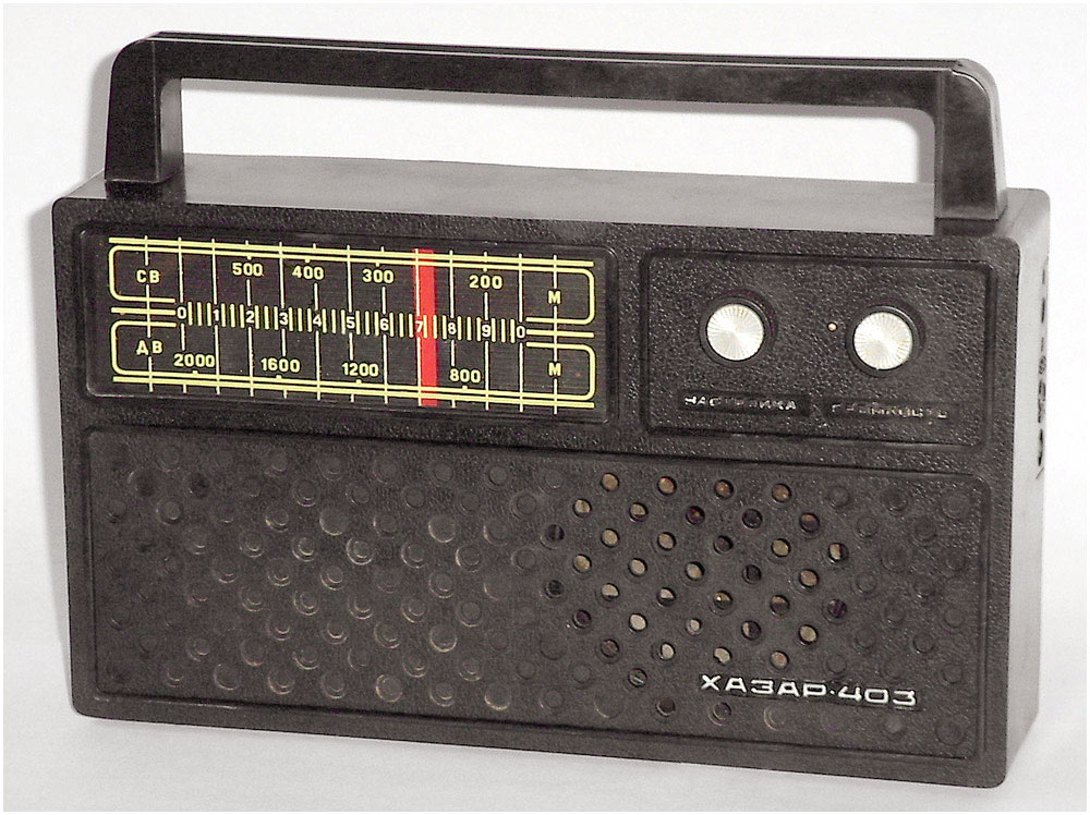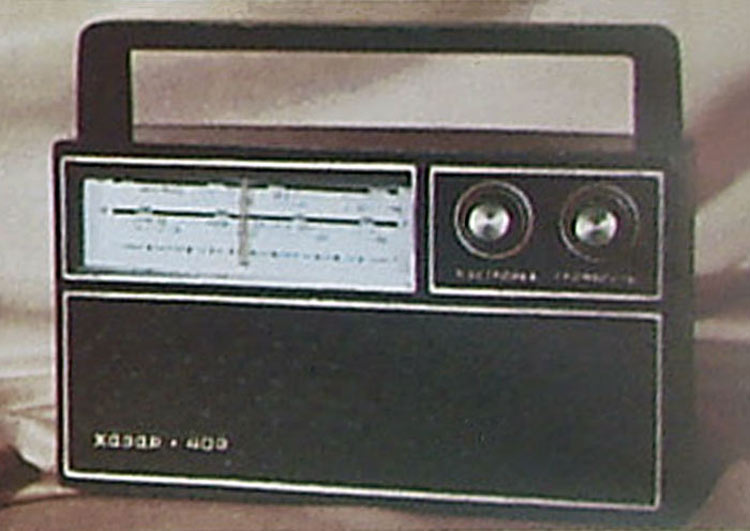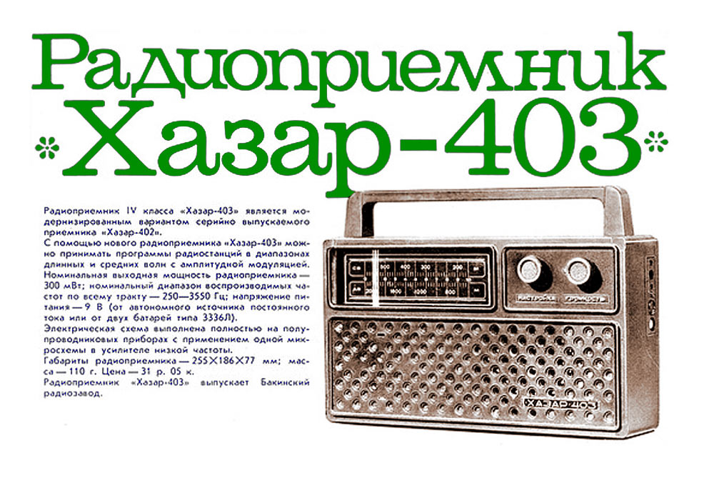 Портативный транзисторный радиоприёмник 4 класса *Хазар-403* с 1980 года выпускал Бакинский радиозавод. Год выпуска радиоприёмника **Хазар-403** был отмечен сразу двумя знаменательными событиями. В этом году в Москве состоялась **Олимпиада-80** и исполнилось 60 лет Азербайджанской ССР в столице которой, Баку и выпускали радиоприёмник **Хазар** (в переводе с азербайджанского яз. Каспий). Юбилейный приёмник был разработан по конструкции и оформлении отличающийся от обычного радиоприёминка, фотографии этого юбилейного варианта смотрите на фотографиях 4, 7, 9 и 10. Олимпийское оформление есть в справочнике И.Ф.Белова. С 1981 года приёмник выпускали в обычном оформлении. Радиоприёмник **Хазар-403** это переносной супергетеродин, собранный на восьми транзисторах и двух диодах. Радиоприёмник работает в диапазонах ДВ и СВ. Его чувствительность в диапазонах: ДВ 1,5 мВ/м, СВ 0,8 мВ/м. Избирательность по соседнему каналу 20 дБ. Номинальная выходная мощность 300 мВт, максимальная 600 мВт. Полоса воспроизводимых звуковых частот 250...3550 Гц. Питание от двух батарей 3336Л. Габариты радиоприёмника 256х187х83 мм. Вес 1,1 кг. На втором фото первоначальный опытный образец радиоприёмника.