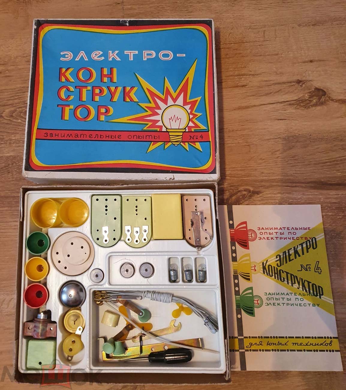 Занимательные опыты по электричеству *Электроконструктор № 4* выпускался предположительно с 1987 года Московским ПО *Геофизприбор*. Описание нет.