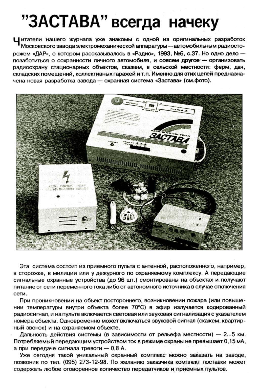 Автомобильная охранная система *Застава* разработана в 1994 году Московским заводом электромеханической аппаратуры. Подробнее смотрите ниже.