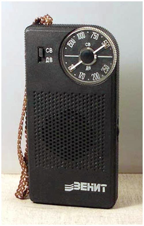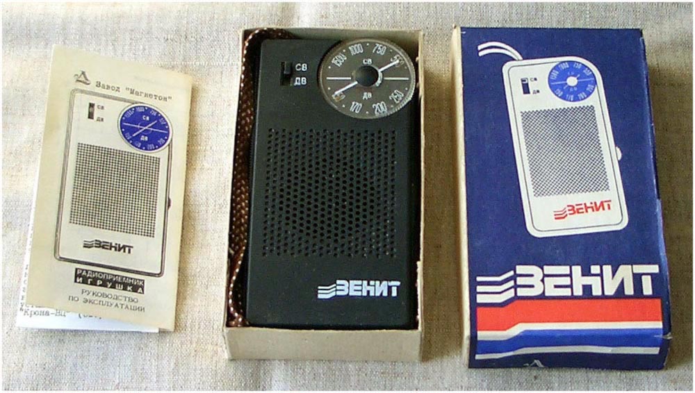 Портативный радиоприёмник-игрушка *Зенит* с I-кв 1994 года выпускал Ленинградский завод *Магнетон*. Радиоприёмник **Зенит** предназначен для детей от 10 лет и старше. Радиоприёмник собран по схеме прямого усиления (3-V-4) на восьми транзисторах и рассчитан на приём радиовещательных станций в диапазонах длинных и средних волн. Чувствительность на обоих диапазонах не менее 15 мВ/м. Селективность по соседнему каналу 10...12 дБ. Максимальная выходная мощность около 50 мВт. Питание 9 вольт. Ток в режиме покоя 8 мА, максимальный ток потребления 40 мА. Габариты радиоприёмника 135х75х31 мм. Масса без батареи питания 160 гр.