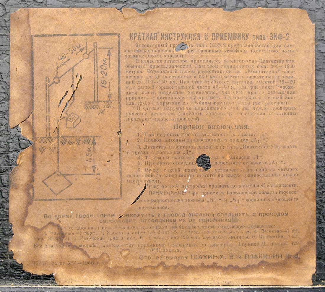 Радиоприёмник детекторный *ЗИФ-2* с 1946 по 1948 год выпускал опытный завод № 326 имени М.В.Фрунзе НКАП. Приёмник предназначен для прослушивания программ радиовещательных станций на головные телефоны (допускается пользование двумя парами). В качестве детектора можно применить цвитектор или обычный, кристаллический. Диапазон принимаемых волн 300...1800 метров. При использовании антенны длиной 40 метров, с высотой подвеса 15 метров и заземления приём местных радиостанций, с достаточной громкостью возможен на расстоянии до 150, а центральных до 500 километров.