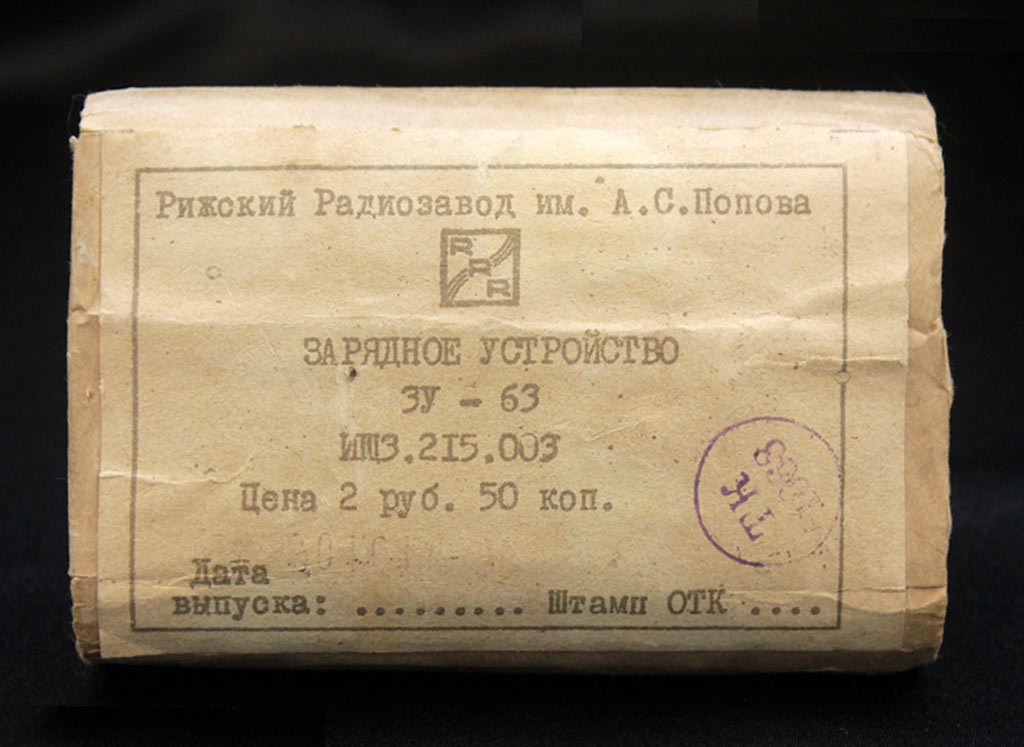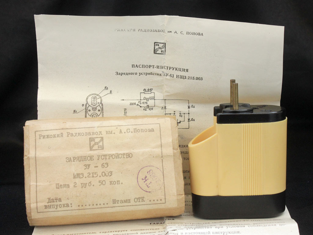 Зарядное устройство *ЗУ-63* выпускалось предположительно с 1963 года Рижским радиозаводом имени А.С.Попова. ЗУ предназначено для зарядки аккумуляторов типа *7Д-0,1*, используемых для питания малогабаритных радиоприёмников. Розничная цена ЗУ - 2 рубля 50 копеек.